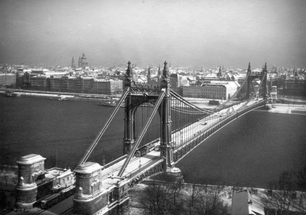 Így nézett ki az Erzsébet híd 1945-ig, és természetesen ennek is a második világháború vetett véget: a visszavonuló németek több más híddal együtt a vízbe robbantották. 1903-as átadásától kezdve huszonöt éven keresztül ez volt a világ leghosszabb egynyílású hídja, amely mederpillér nélkül 290 méter hosszú volt! De hogy lássuk, nem csak a méret a lényeg, a maga korában a világ egyik legszebb lánchídjának is tartották.