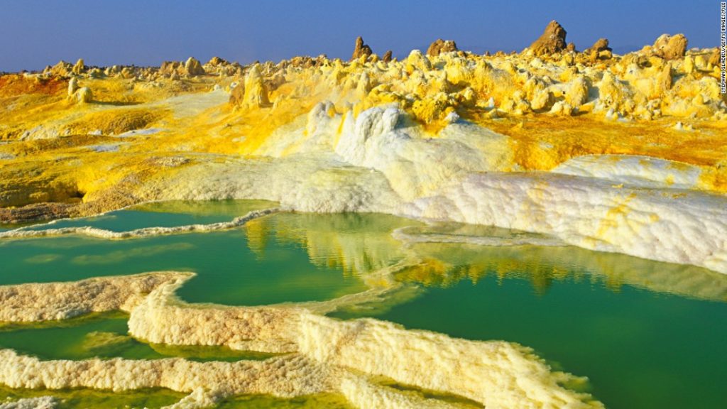 A Dallol vulkán a legforróbb és egyben az egyik legszínesebb terület a világon. A színpompás só kúpok, a kőzetek és sziklák sárgás árnyalata már-már valószerűtlen.