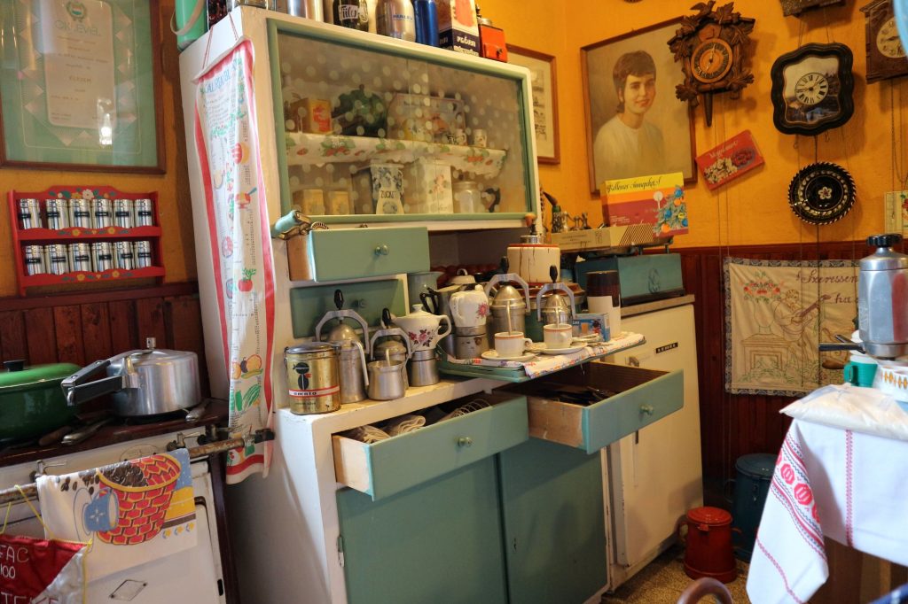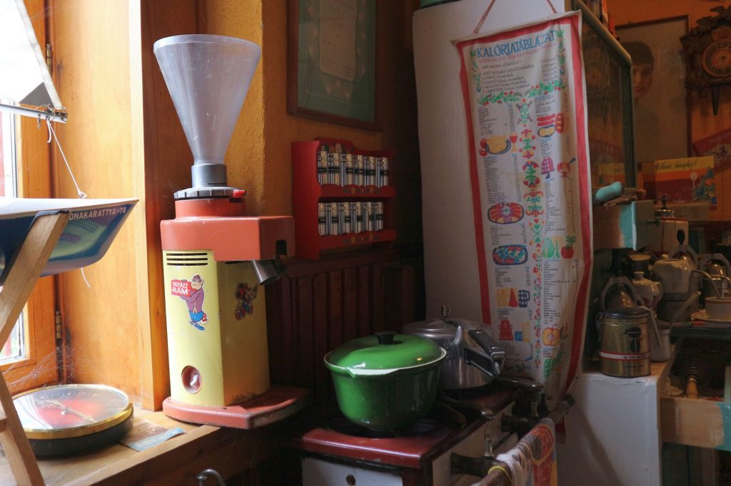 A bolti kávédarálón még ott egy korabeli matrica is. A háttérben a kalóriatáblázat-falvédő megvan? Az ember emlékezete képtelen fókuszt találni a múzeumban, egyszerre veszünk észre mindent, és csak szikrázik az agyunk
