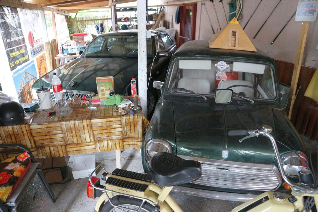 A gyűjtemény eklektikáját a végsőkig feszíti egy Mini és egy Jaguar XJ az épülethez ácsolt fészerben. Ernő ezekre is büszke, lelkesen mutatja, mennyire megkímélt a Jaguar finom bézs bőrkárpitozása, de én ide már végképp nem tudom követni. Hiába vagyok elsősorban autós szakújságíró, egyszerűen túl nagy ugrás ez most, az Ötvös Csöpi-plakátok és a Moszkvics piros műbőrülésére rakott színhelyes írógép után.