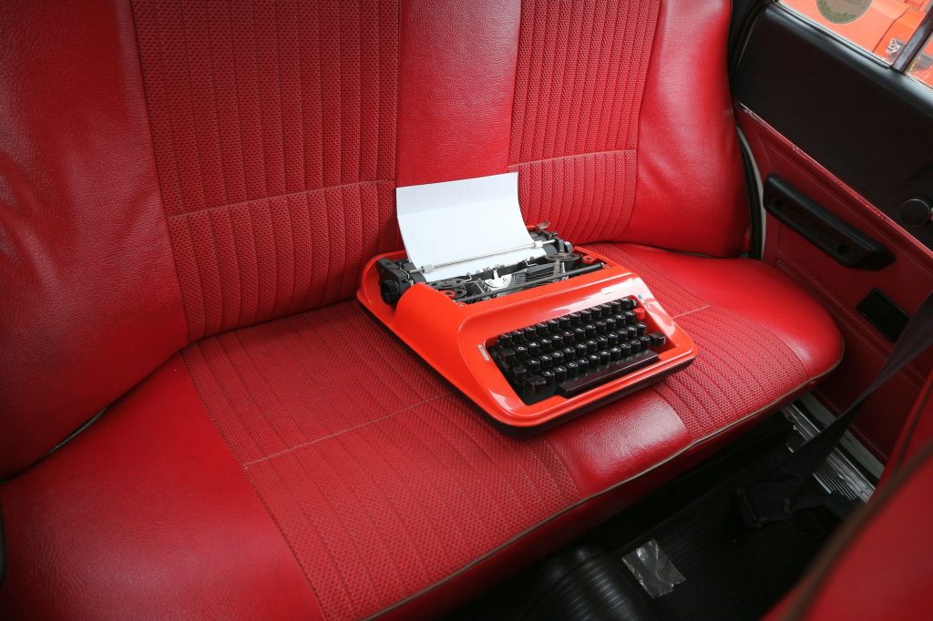 Csodás stílusérzékkel kerül a csizma az asztalra, illetve a piros írógép a piros Moszkvics-ülésre