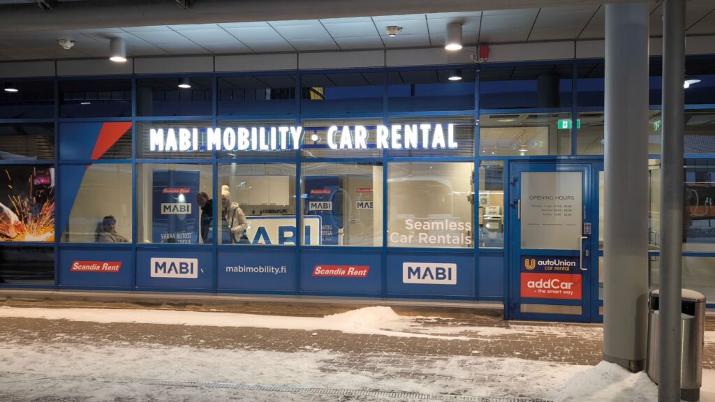 A bérautó átvétele sem okozott gondot. A foglalási visszaigazoláson szereplő infók alapján simán megtaláltuk a reptéri terminál melletti épületben a cég irodáját. Utána volt pár lélegzetvisszafojtott perc, amíg az autóátadós srác a backoffice-rendszerben kibogarászta, hogy ki foglalt, kinek a nevére, milyen kártyával, de végül megkaptuk a kulcsot. Az azért furcsa volt, hogy a Rentalcars.com brókeren keresztül foglalt, egy Economy Rentals nevű cég kocsijának kulcsát egy MABI Mobility cégérrel díszített irodában kaptuk meg, majd a kocsit a parkolóház Scandia Rent táblával jelzett parkolóhelyén találtuk meg. Szövevényes maffia lehet a finn bérautós biznisz mögött!