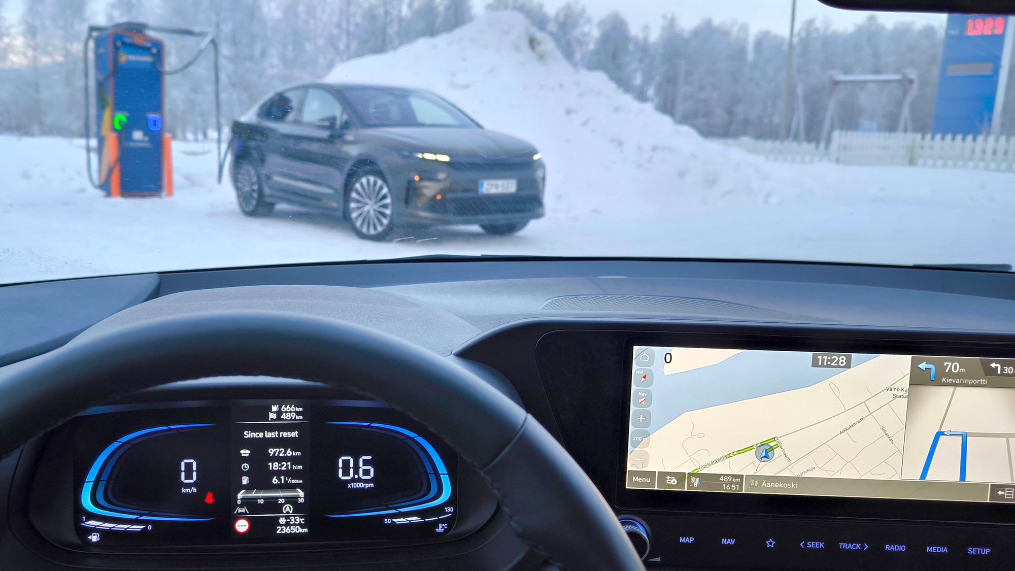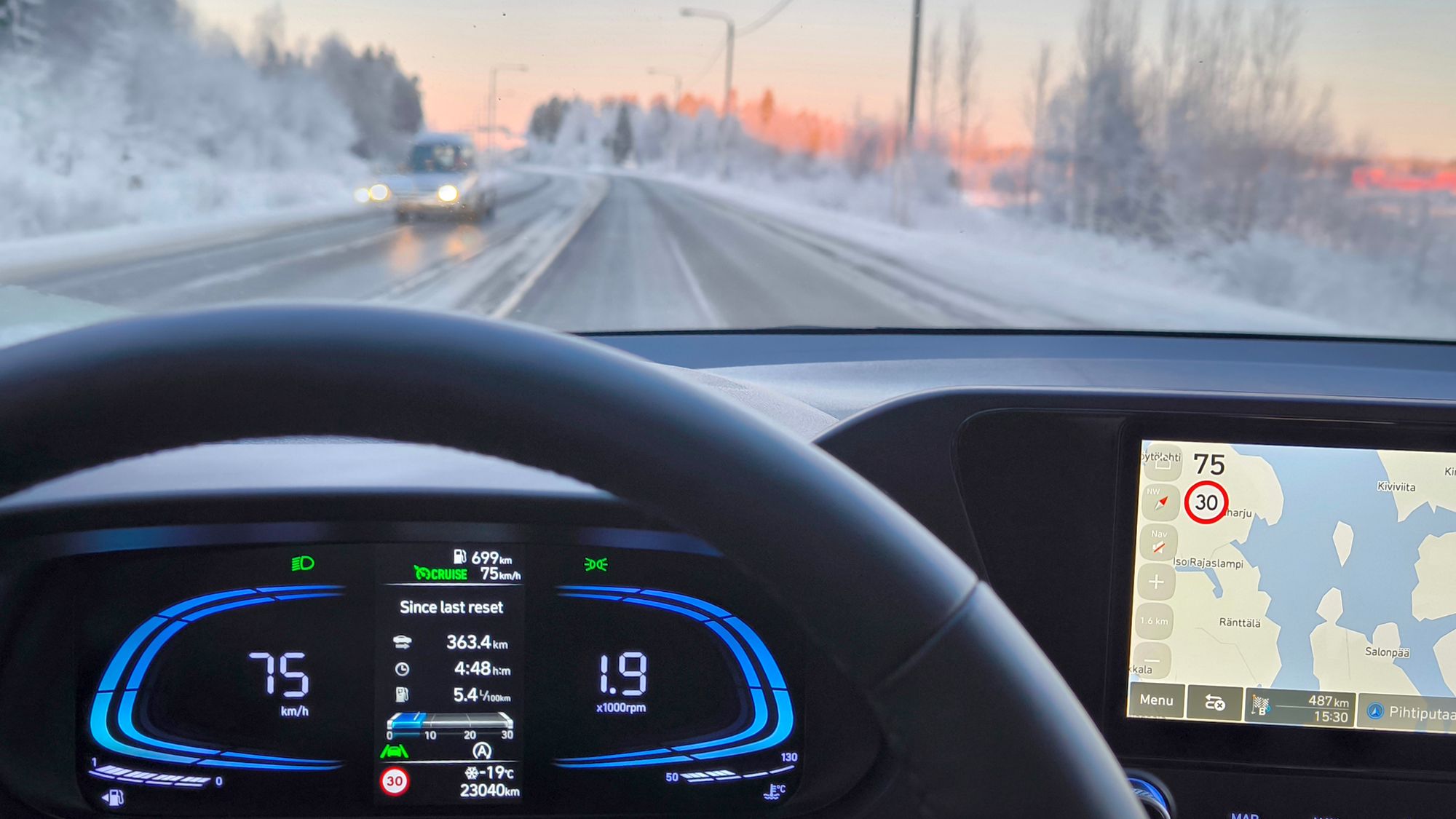Az első szállásunk Helsinki felett kb. 300 kilométerre, Äänekoskiban volt. Errefelé ritka az ilyen hideg, mondta szállásadónk a -22 fokos hajnalon, amikor pólóban és kötényben áthozta nekünk a szomszéd épületből a meleg reggelinket, de a kocsi pöccre indult. És pöccre indult másnap reggel Pellóban, a sarkkörtől vagy 30 kilométerre északra is, -30 fokban is. Harmadnap, a -35 fokos útirekord-pillanatban azért már aggasztóan lassan forgott az indítómotor és volt egy kis ritmustalanság is a hengerek járásában az első pár másodpercben, de ennyi. Az alapjárat szinte azonnal beállt, utána pedig épp olyan egykedvűen ketyegett a koreai technika, mint nyár közepén tenné.