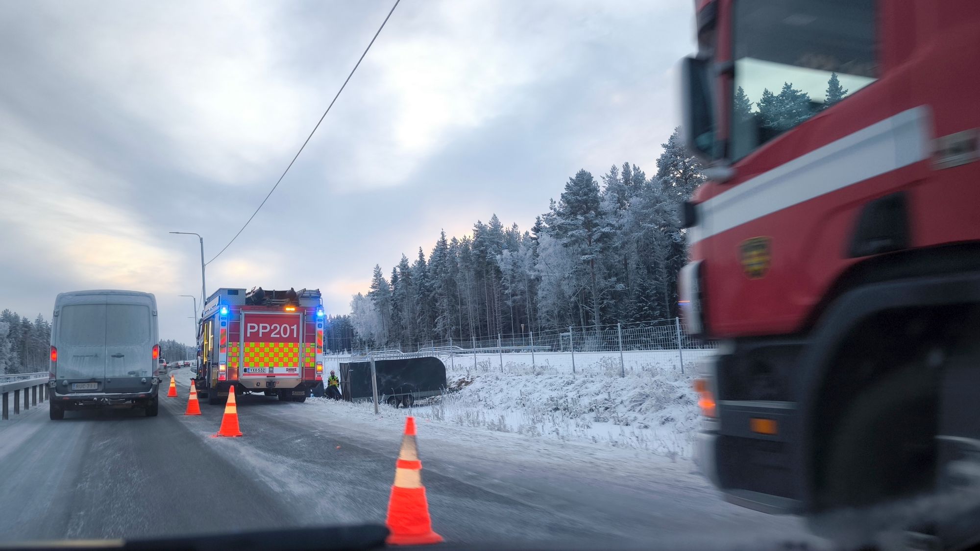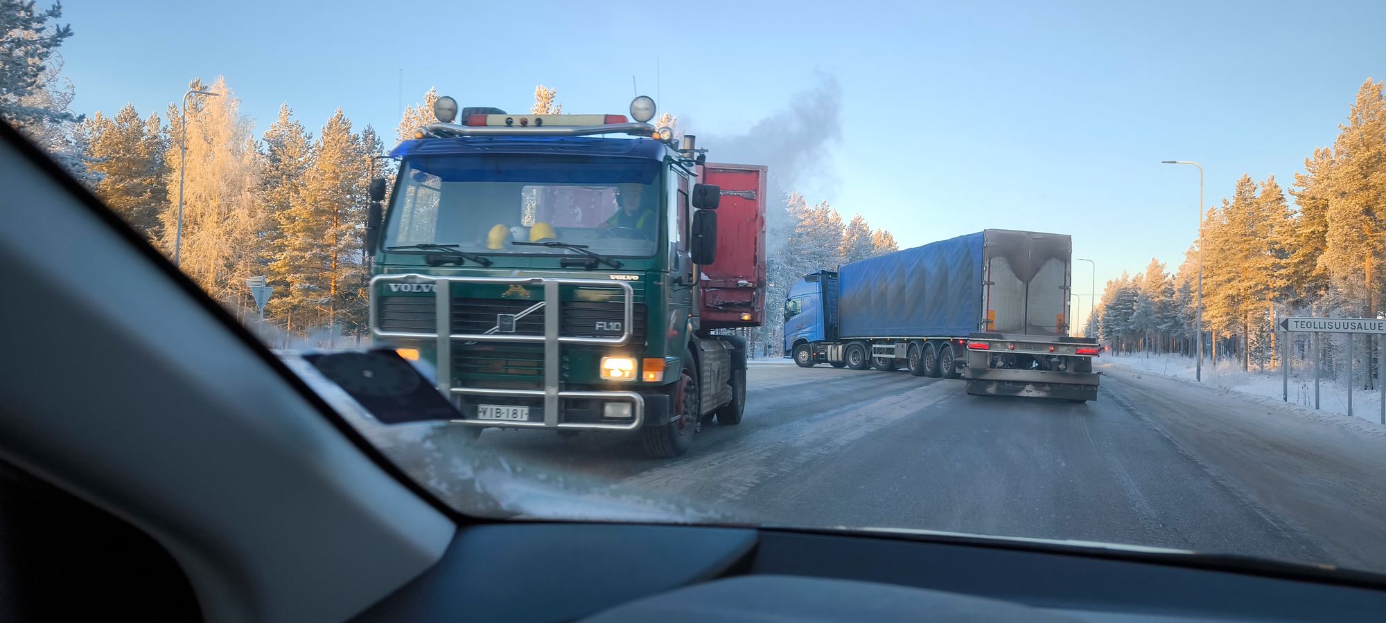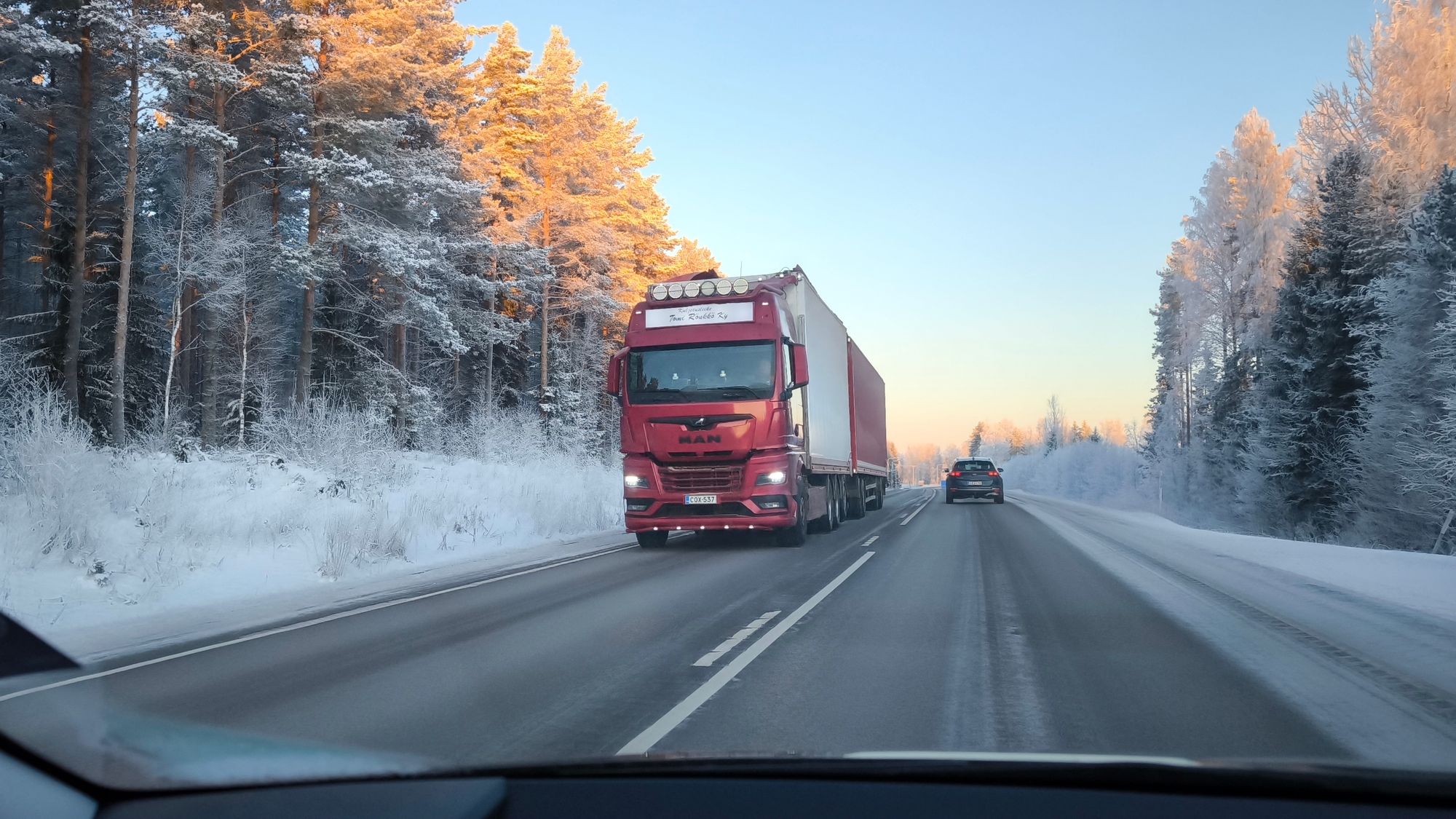 Az irdatlan teherautók méretét kell egy kicsit szokni. Egy átlagos finn kamion úgy néz ki, hogy a szóló nagy teherautó vontat egy elülső kettős tengellyel is felszerelt teljes méretű félpótot. (Vannak más konfigurációk is.) A közlekedésben persze nem sok jelentősége van, hogy pár méterrel hosszabbak a kamionok, csak az előzésre kell több időt tervezni és érdemes fejben tartani, hogy a bekanyarodó szerelvények is később fejezik be a manővert.