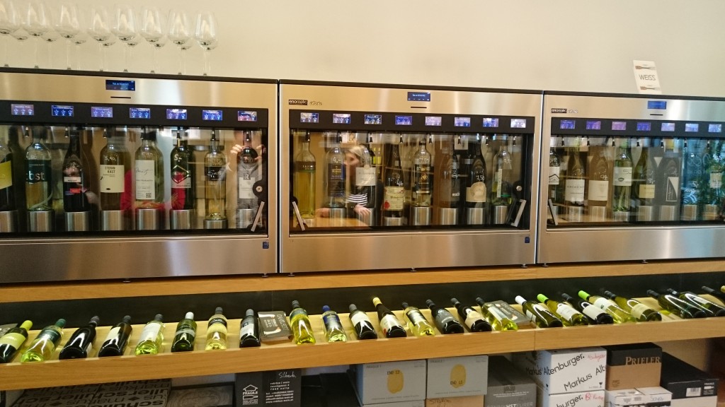 A végére hagytam a legdurvábbat, legalábbis ha szereted a jó bort, akkor ide mindenképpen el kell zarándokolnod. Bár a Gans Purbach nevű kulináris fesztiválra érkeztünk volna, a szemerkélő eső és a feltámadó szél nem igazán rakta bele a bugit a látogatók lábába. A fesztivált sajnos a helyszínen lefújják, azt azonban még a taknyos szürkeség sem tudja megakadályozni, hogy megnézzük a városka borászatát, ami tulajdonképpen nem más, mint az egész térség hihetetlen összefogása nyomán megvalósuló bor-szentély. Itt több, egyenként hatvanezer eurós berendezés tartja frissen a megbontott palackok tartalmát, így egy helyen bevizsgálhatod a környék összes kisebb pincészetének alkotásait – potom pénzért. Idegenvezetőnk ráadásul hozott magával házikenyeret, mellé egy kis zsírba szaggatott libahúst gránátalma-pürével. Simán el tudjuk ütni az időt, amíg odakint tombol a morcos október.