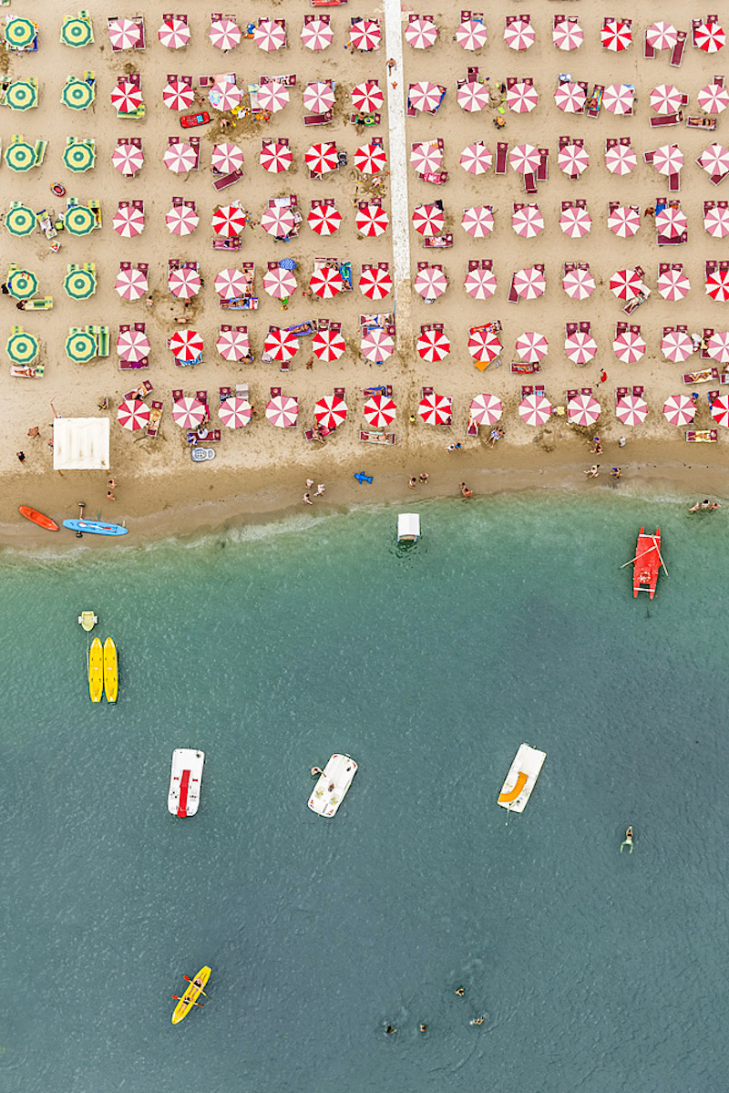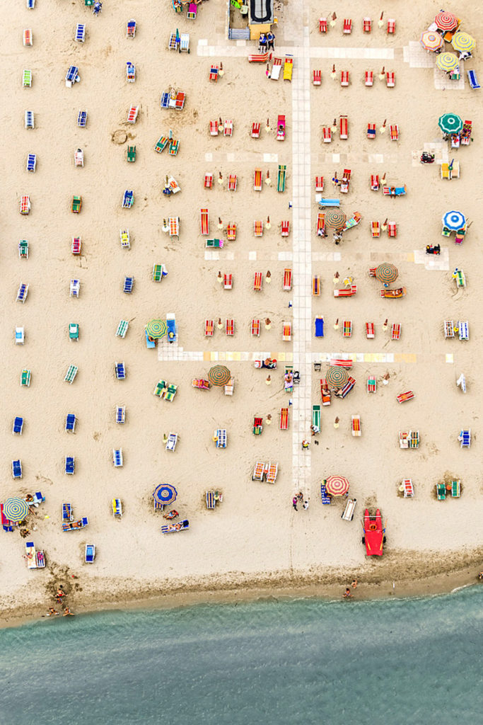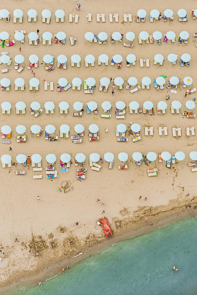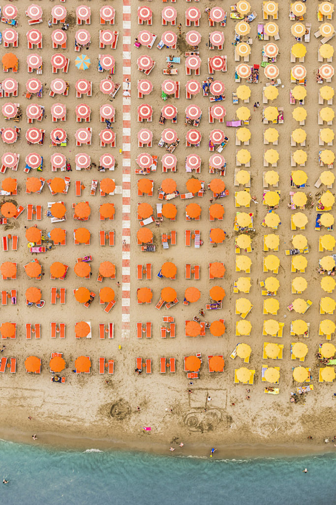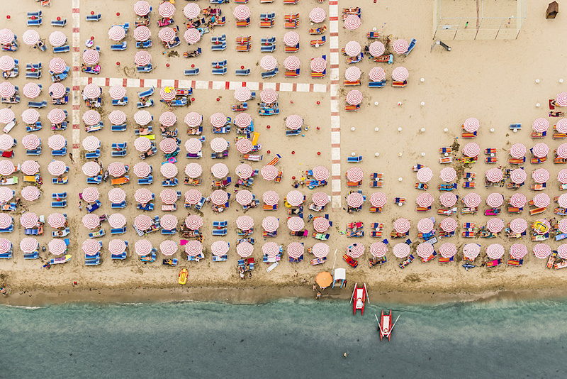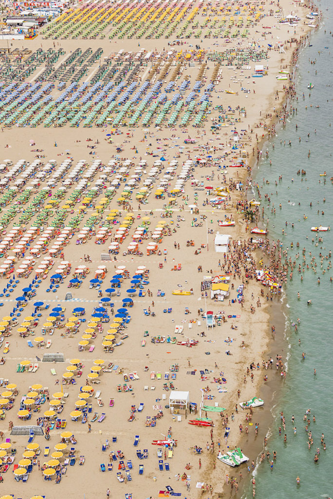 Ha Olaszország jut az ember eszébe, ritkán azonosítja olyan kifejezésekkel, mint a szervezettség, a pontosság vagy a rend. Pedig ha megnézzük, milyen takaros és szabályos formákba rendezték az Adria partján sorakozó strandjaikon a napernyőket és a napágyakat (umbrella e lettino), akkor bizony láthatjuk, hogy tudnak a derék taljánok, ha akarnak. Bernhard Lang fotóst annyira lenyűgözte ez a rend, hogy felröppent az Adriai tenger különböző strandjai fölé, hogy megörökítse ezt az olasz néplélektől fényévnyi távolságban lévő fegyelmezettséget, az egyenesek, a párhuzamosok, a merőlegesek, az azonos távolságban lévőségek, szóval úgy összességében a szabályosság irányába mutató buzgalmat.