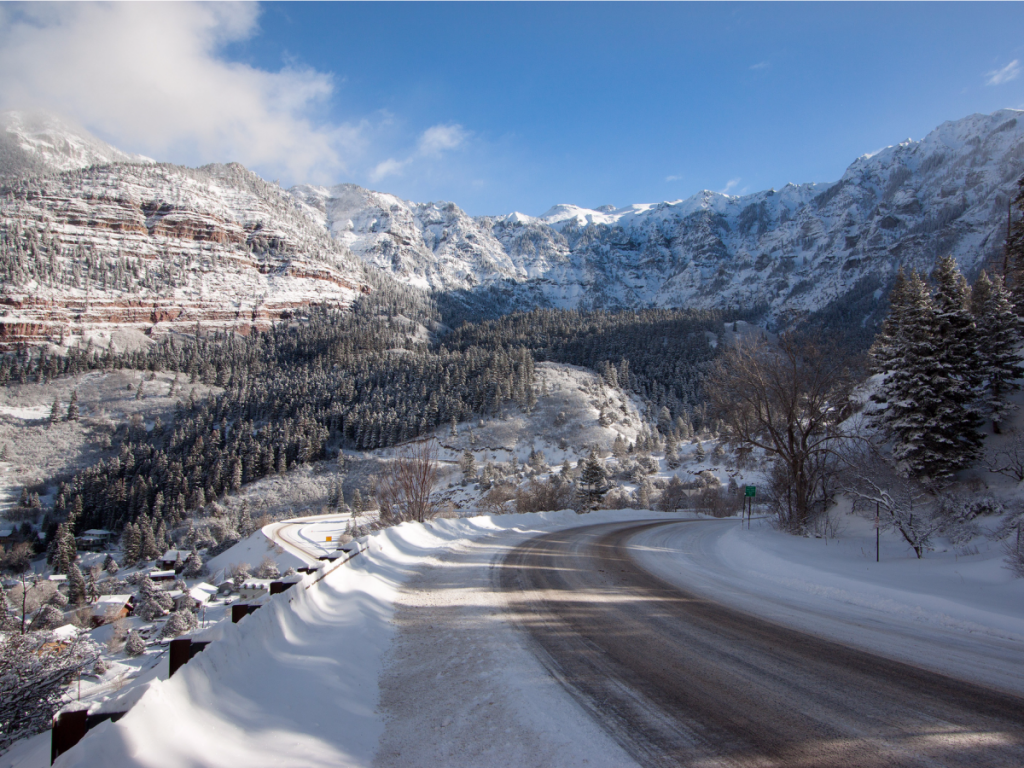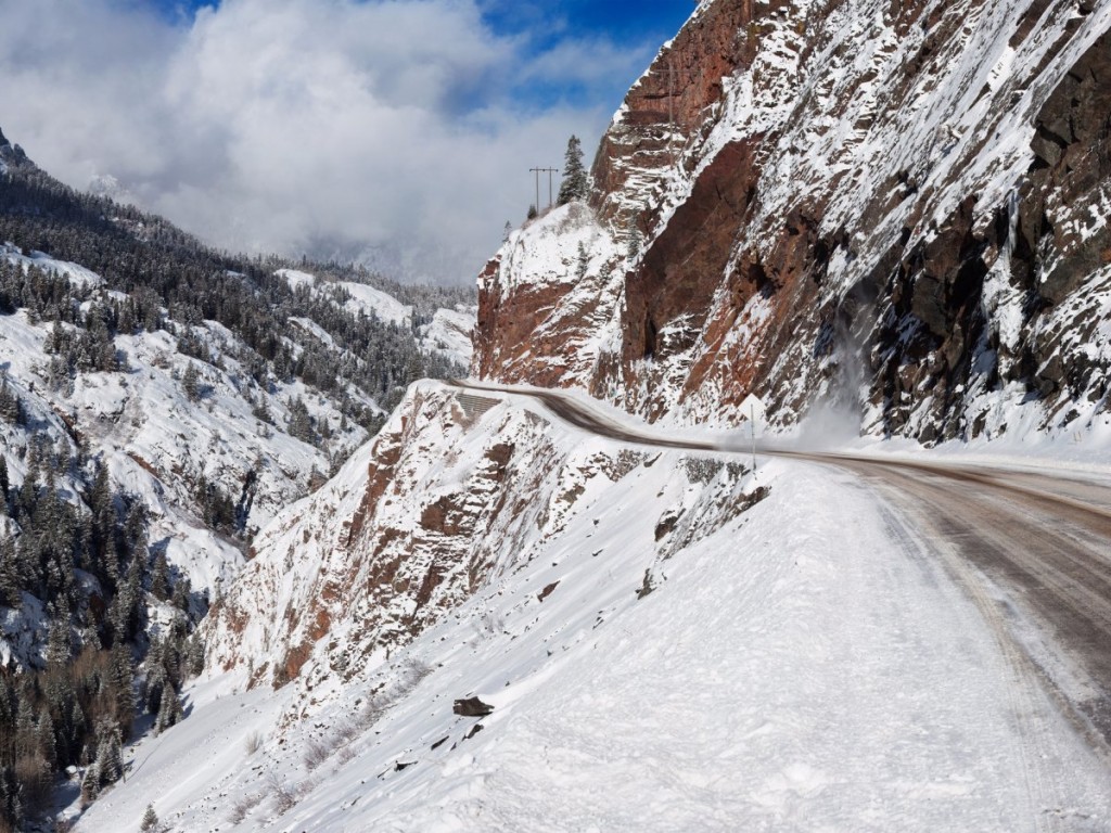 A US Route 550 több ezer méteres csúcsok alatt, sziklák oldalába vájva tekergőzik a Sziklás-hegységben.