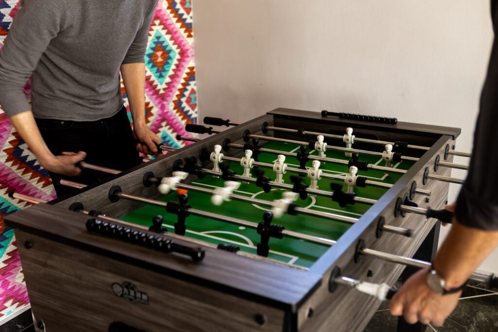 Kaja előtt és után az épület másik felében lévő, még nagyobb különteremben töltöttük az időt, rendezhettünk volna egy kisebb bált is, de mi inkább csocsóztunk, társasoztunk, zenét hallgattunk.