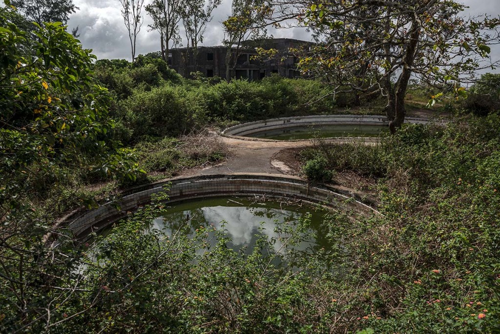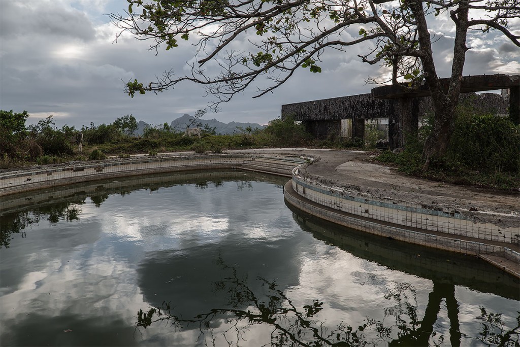 A Fülöp-szigetek egyik kiürített szállójának lassan mocsárrá váló úszómedencéje. Egykor gyerekzsivaj, most halálos csend tölti be a tájat.