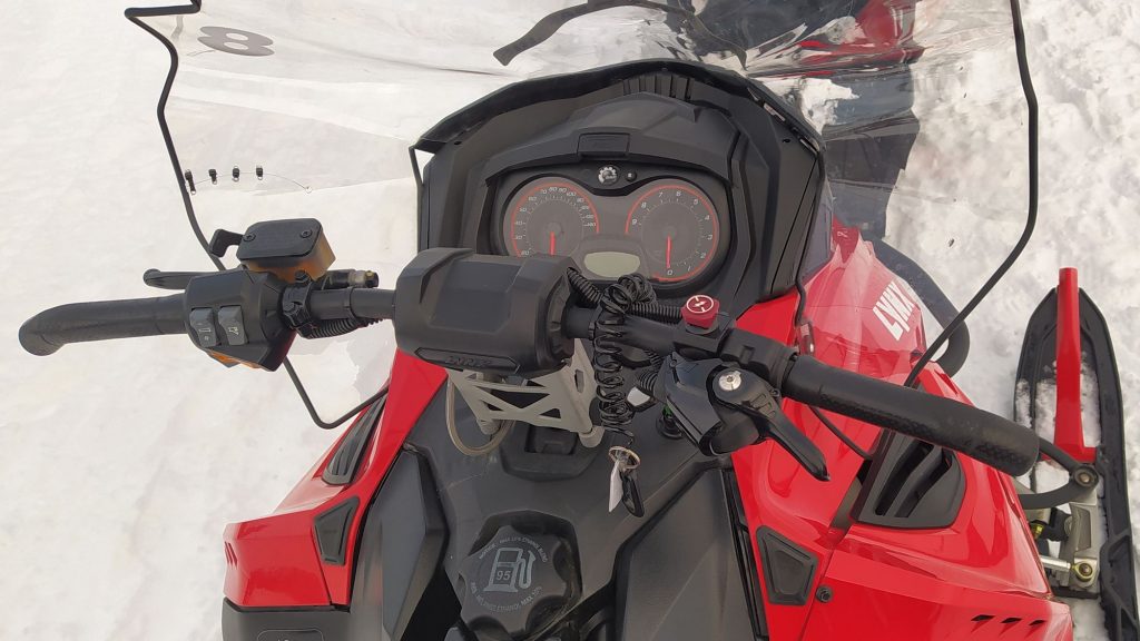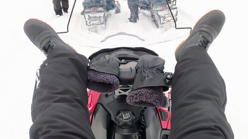 Ahogy a túravezető látja, hogy nem esünk le, megálljt vezényel (feltartott kéz) és végigjárja a gépeket. Kulcsot cserél a gyújtáskapcsolón: a fojtott teljesítményű kezdő kulcsról átváltunk haladóra. Én bónuszként megtalálom az ECO-kapcsolót is, átpöckölöm SPORT-ba. És hirtelen 30-40 helyett máris a maximális 60 lóerő van a 600-as Rotax-motorban, a túravezető pedig megbolondul, és 70-80-nal megyünk a befagyott tavon. De sajnos még mindig egymás nyomában. A rángatás iszonyúan felerősödik, már rendesen kapaszkodnom kell, hogy ne essek le. Rájövök, hogy a hómobil tulajdonképpen egy ló. Érdemes térddel szorítani, combból kiemelkedni az ülésből és próbálni kirugózni a tőlünk úgyis függetlenül mozgó, saját akarattal rendelkező gép oldalirányú rántásait. Így egy kicsit jobb, viszont még van egy óra a célig.