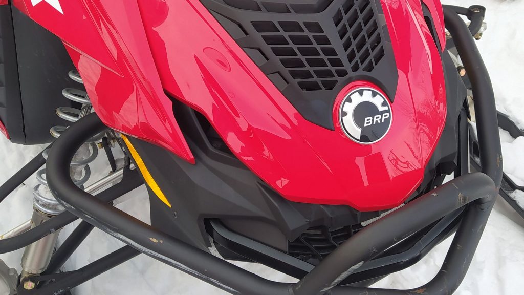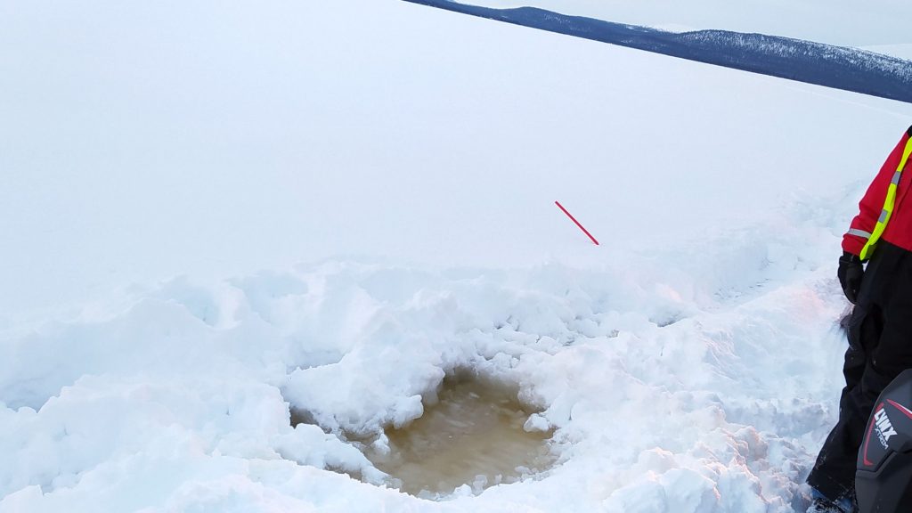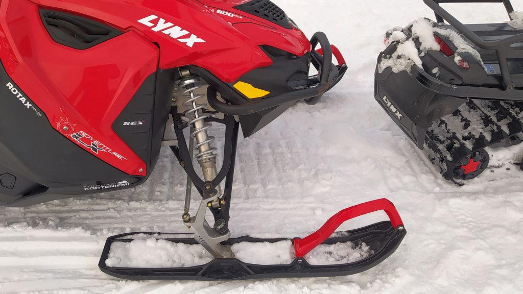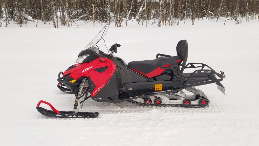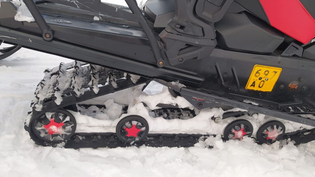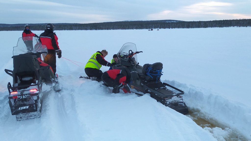 És basszus tényleg; az egyik kolléga kicsit kimegy a letaposott nyom szélére, a szán megbillen, a lánctalp elkapar, kidobja maga alól a havat, leér a latyakig, alatta a jégig és kész, ennyi. Na sebaj. A Lynx Adventure LX 600 nem olyan nehéz gép, olyan 240 kiló. Páran megfogjuk, hó-rukkolunk, kihúzzuk.