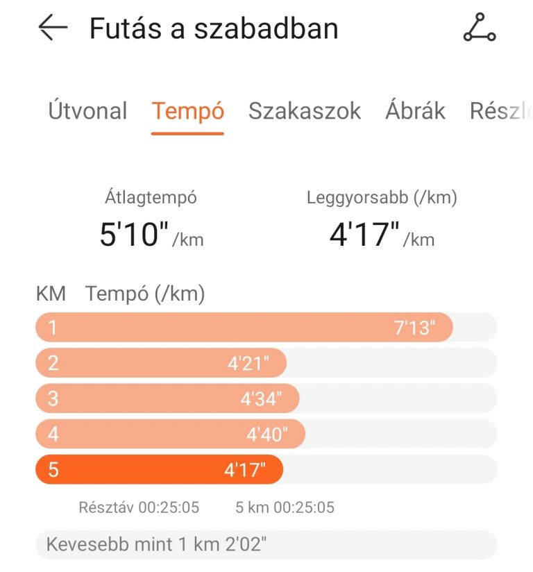 Furcsa, de jó érzés volt hallani az adatokat, igazából viszont az otthoni kiértékelés az igazi. Ha akarjuk (márpedig akarjuk), a WATCH GT Runner megméri a pulzusszám-regenerálódást, a távot pedig egyben, és szakaszokra bontva is elemzi. Megtudom a lépésszámot, a lépések hosszát, pontosan méri a szintemelkedéseket, heti edzési terhelést, erőnléti állapotot mutat, méri a VO2 max-ot, azaz a vér maximális oxigén felvételi szintjét.