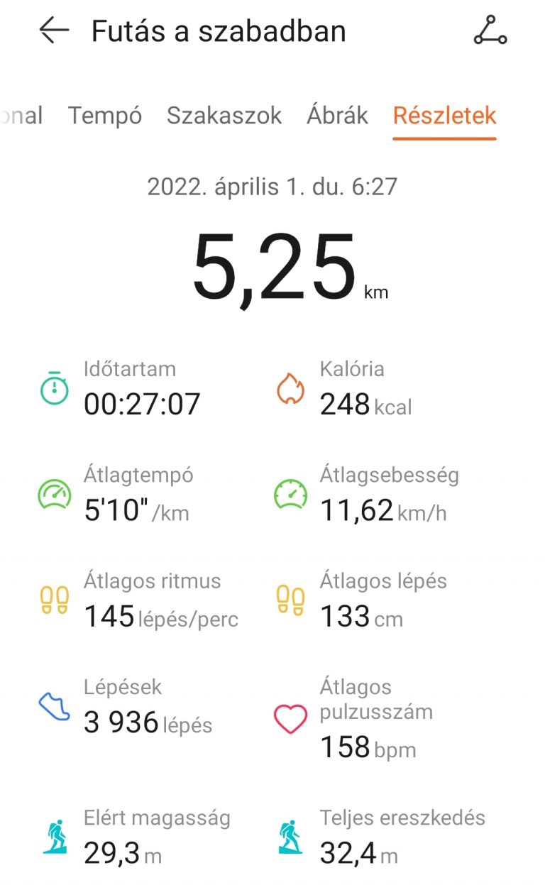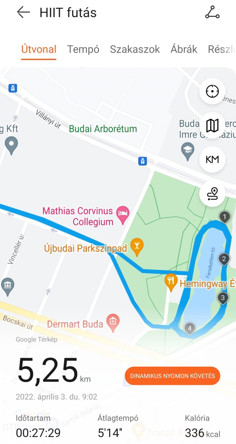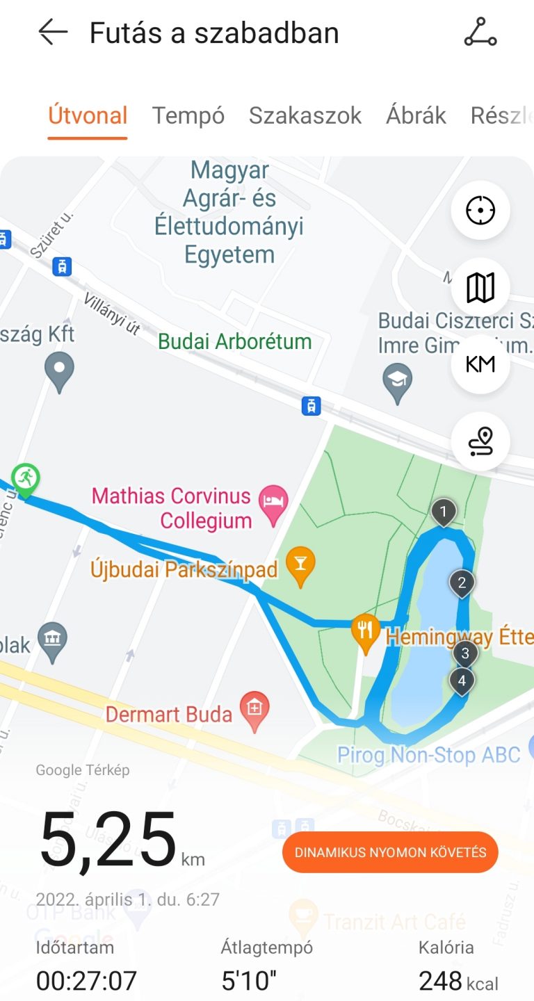 Egy gyors párosítás (a HuaweiHealth applikációt az AppGallery-ből célszerű letölteni), majd az óra és az app rövid böngészése után neki is vágtam az első edzésnek. Bár több mint százféle edzésmódot találsz előre beprogramozva – számtalan futásmód mellett kerékpározást, úszást, triatlont, síelést –, elsőre a saját megszokott rutinomat térképeztem fel. A szokott 5 kilométeremet futottam, szokatlan körülmények közt: a feneketlen-tavi tavaszban olykor besétált elém egy-egy illatmámorban kószáló kutyus, máskor meg a rekortán melletti párkányra kellett ugranom az elém guruló kisfiú elől.
