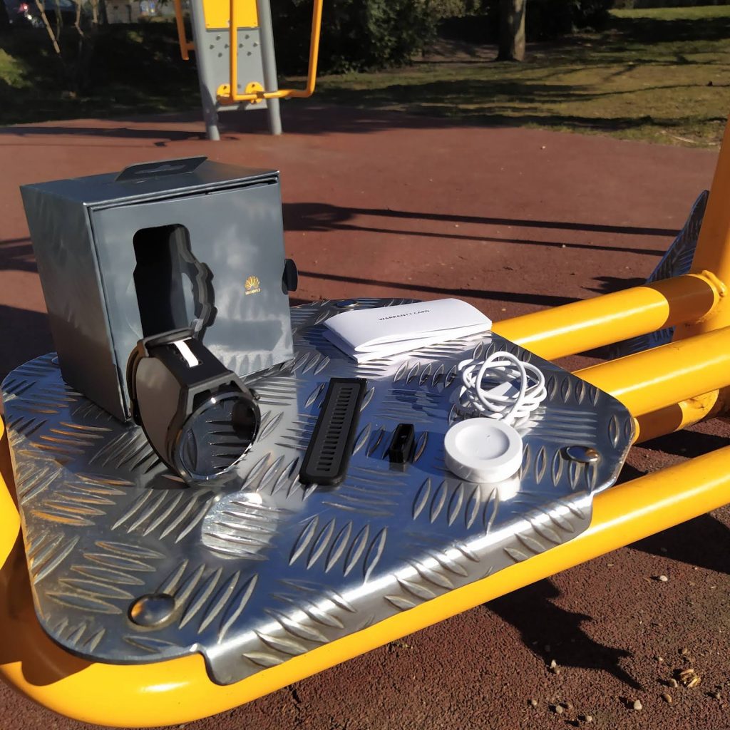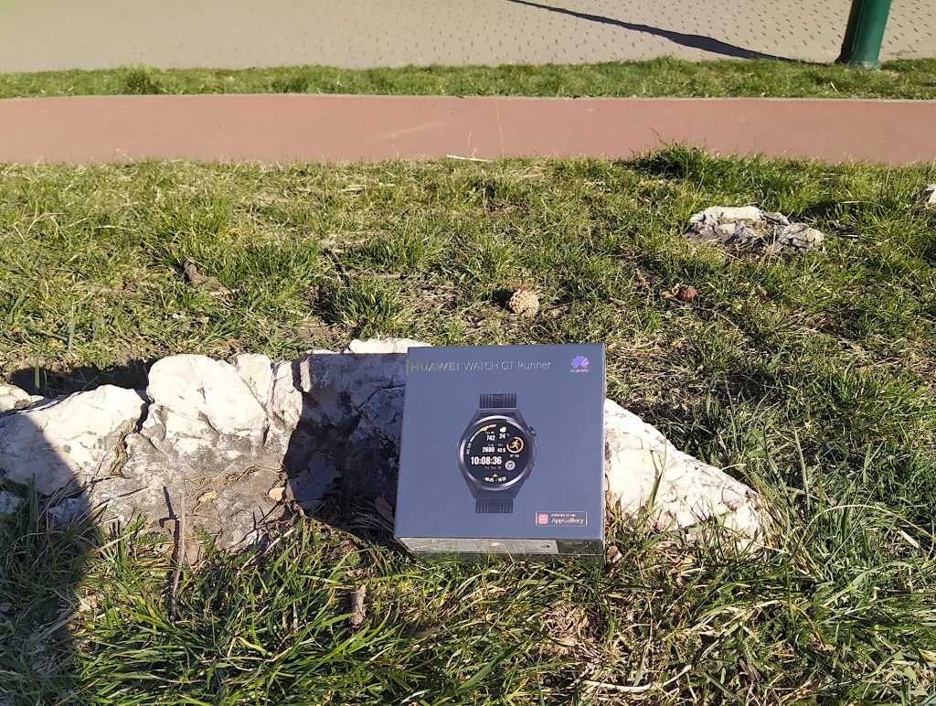 Egy kellemes csomagban érkezik a Runner, benne az órával, egy 10 wattos Qi-töltővel, egy tartalék szíjjal (22 milliméteres, így kompatibilis a többi Huawei óráéval) és a szükséges papírokkal. A szilikon szíj sűrű rácsozata egyrészt jól szellőzik, másrészt pontosan állítható bármilyen méretű csuklóra.