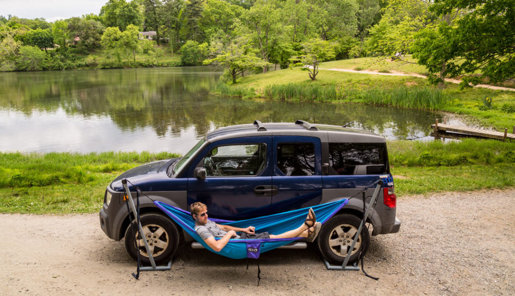Függőágyat az ember főleg ott használ, ahol van fa. Lehetőleg sok. De mi van, ha a homoksivatag közepén kéne installálni a fekvőhelyet? Nincs semmi gond, erre is van megoldás, úgy hívják ENO Roadie. Csak legyen a közelben egy autó.