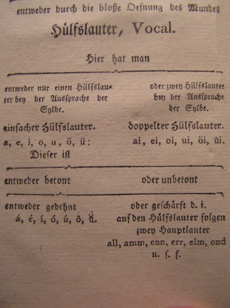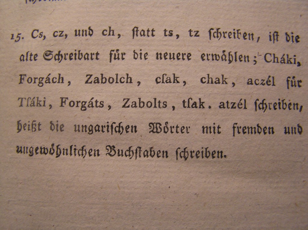 A gót betűkkel szedett mű felsorolja a magyar ABC 31 (!) betűjét, amely azonban azon felül, hogy nem teljes, olyan betűt is tartalmaz, amelyet a mai használatban más karakter helyettesít. Az „á” betűt pedig annak ellenére hagyta ki a szerző, hogy a könyvben utána pedig rendszeresen szerepel. Erre némiképp magyarázatot ad az, hogy a hosszú magánhangzókat külön veszi, lásd alább: