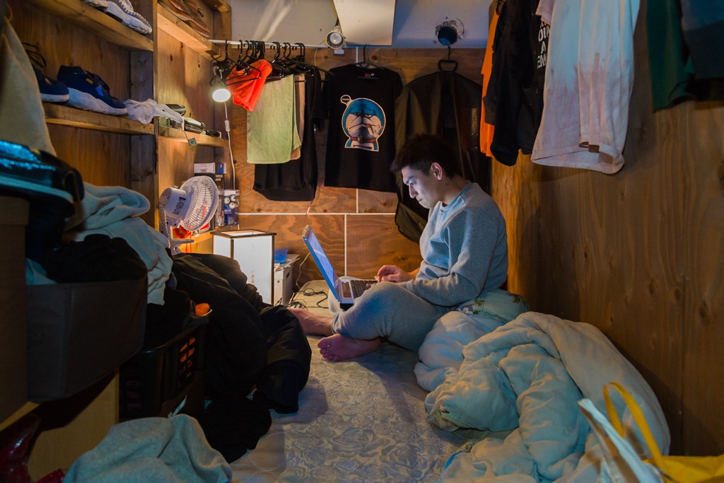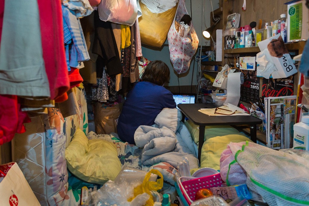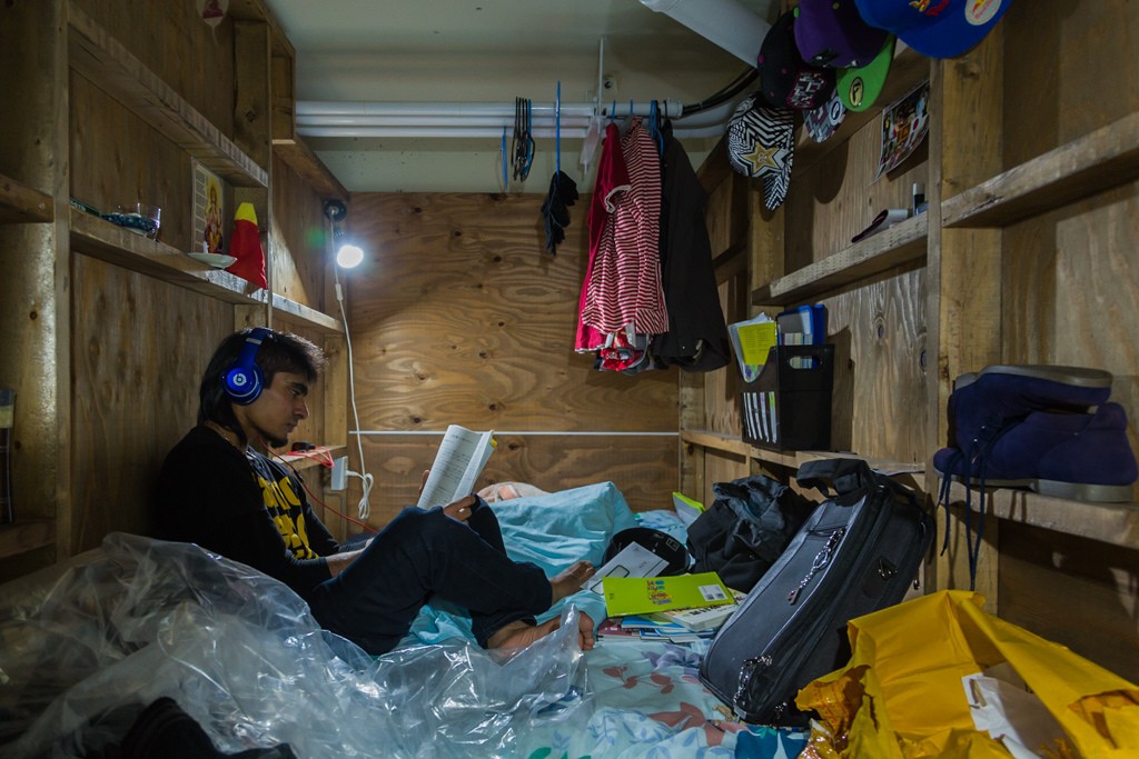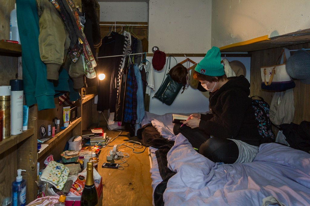 Tokióban átutazók, japán álláskeresők és nincstelen turisták töltik meg a város sok-sok pontján berendezett kapszulahoteleket. Az ablaktalan, alacsony szobatákolmányok nem nagyobbak mint egy dupla matrac – elsőre olyan a tér, akár egy gyerekfogvatartó legborzasztóbb alagsora, amiből minden épeszű ember azonnal kimenekülne. De nem: a bennük lakók gyakran hosszú hetekre, hónapokra kis életfélét rendeznek be maguknak, míg állást találnak vagy továbbállnak. Won Kim japán fotós az Enclosed: Living small című fotósorozatában megörökíti a kétezer ötszáz forint per éjszakás (ezerkétszáz jen) szobák átmeneti lakóit és lakosztályukat.