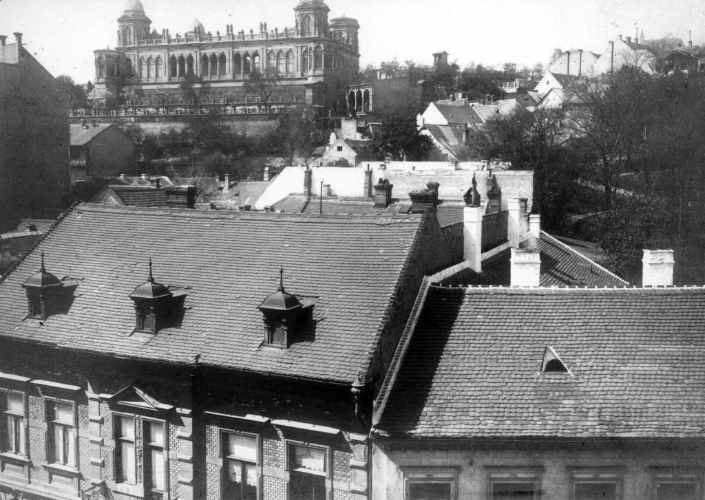 Így nézett ki Budapest belvárosa. Az előtérben lévő telek helyén épült később a Gutenberg tér 2., mögötte a Bródy Sándor (Sándor) utca 27 szám látszik, ettől balra a Mária utca. A felvétel a Kőfaragó utcából készült.