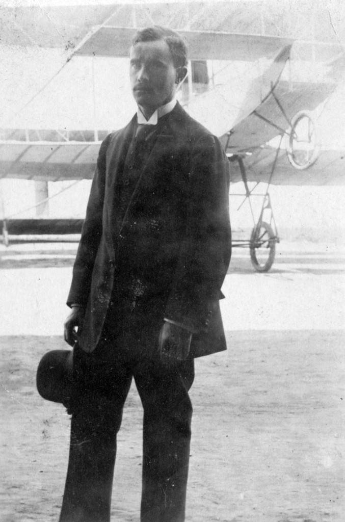 Ez a férfi itt Csermely Károly pilóta, a "rákosmezei repülők" egyike, háttérben egy Voisin Biplane.