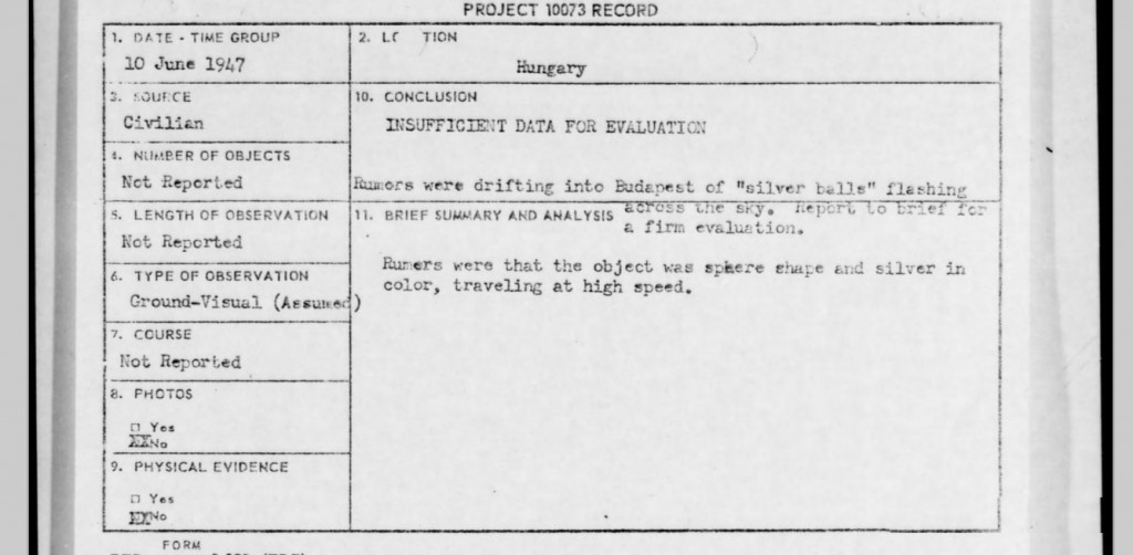 A dokumentum leírása szerint 1947. június 10-én ezüstszínű gömbök villantak fel Budapest közelében. Korong alakúak voltak és nagy sebességgel haladtak. A bejelentés egy civiltől érkezett, az ufók számáról vagy a megfigyelés hosszáról nincsenek adatok.