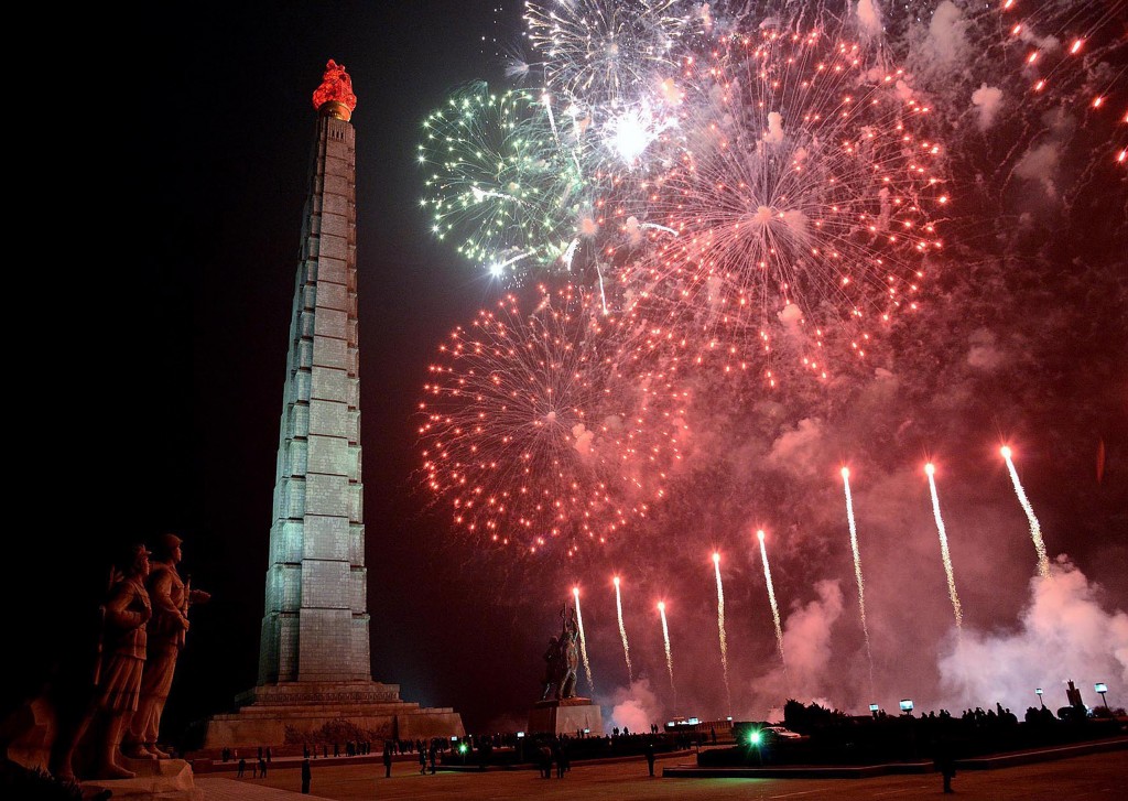 ... aztán jöhet az est fénypontja, a szigorúan pártszínekben prezentált tűzijáték, hogy egy kicsit felmelegedjen a vigyázzban ünneplő tömeg.