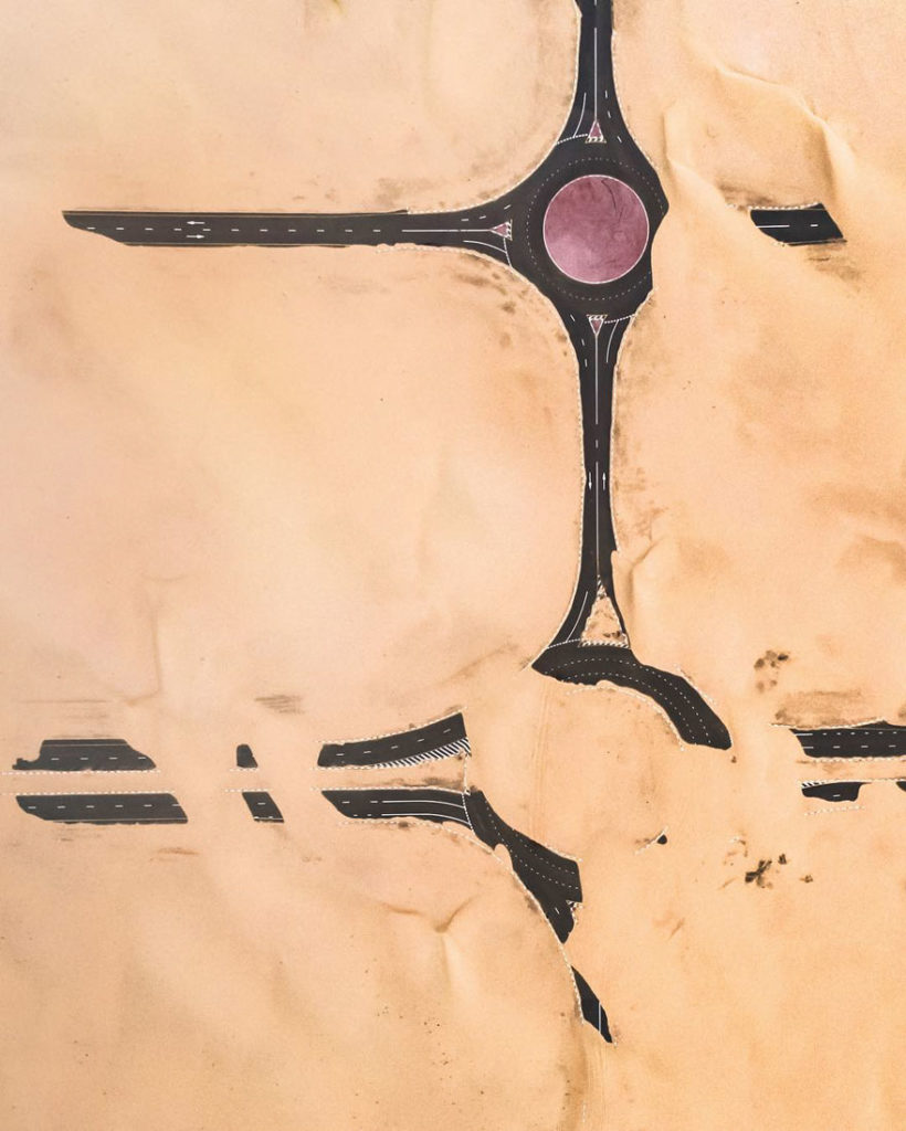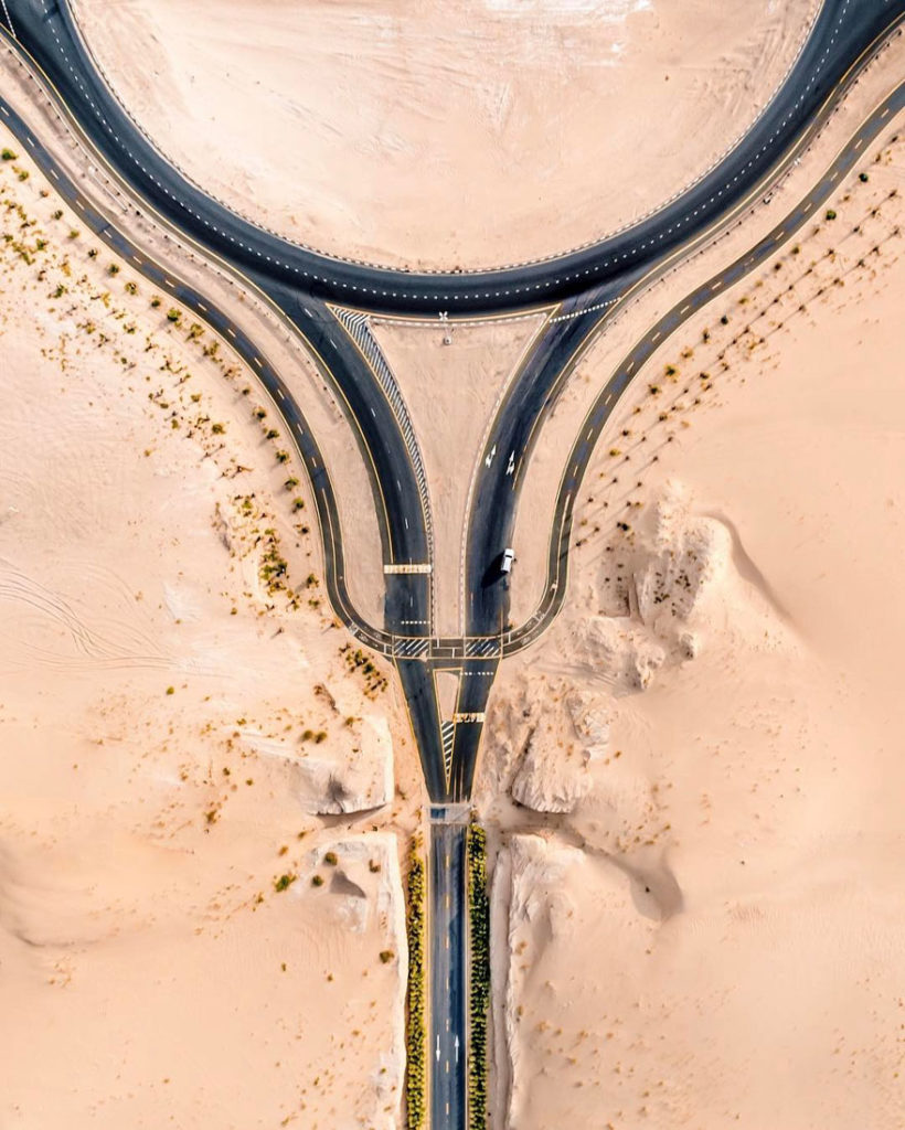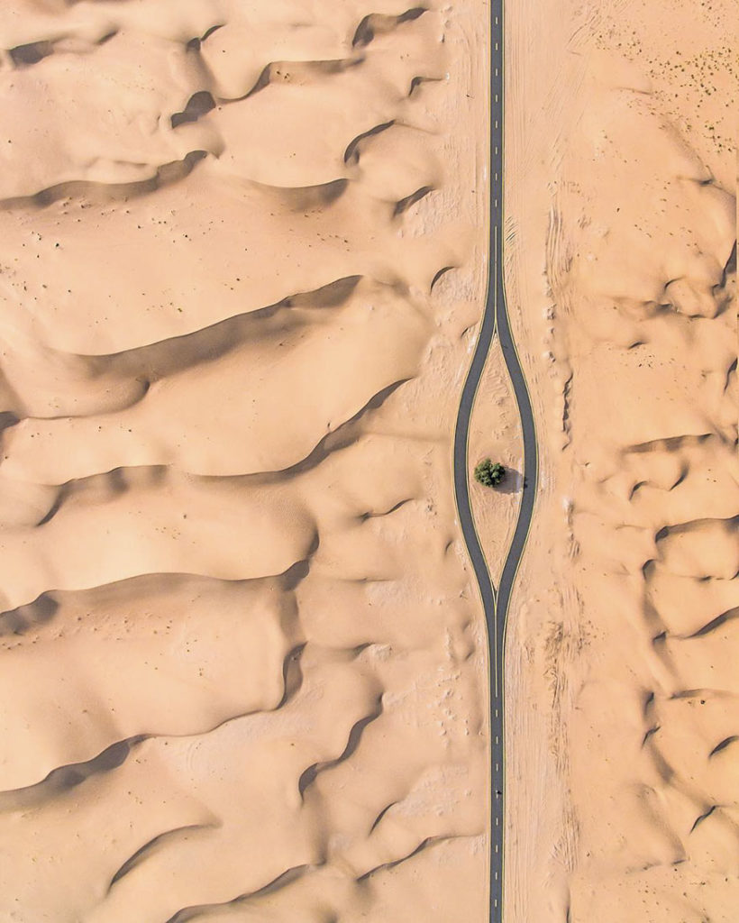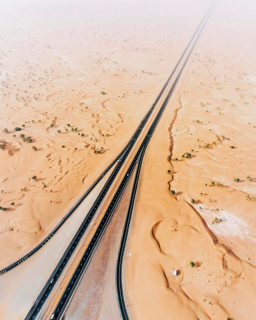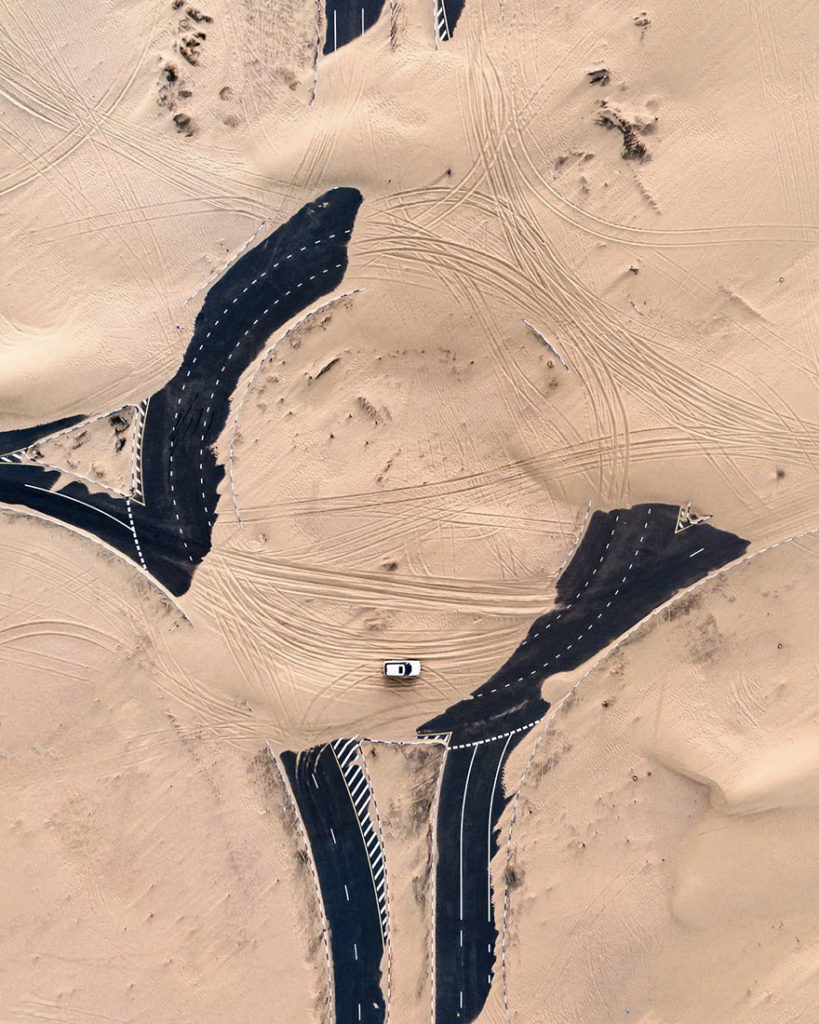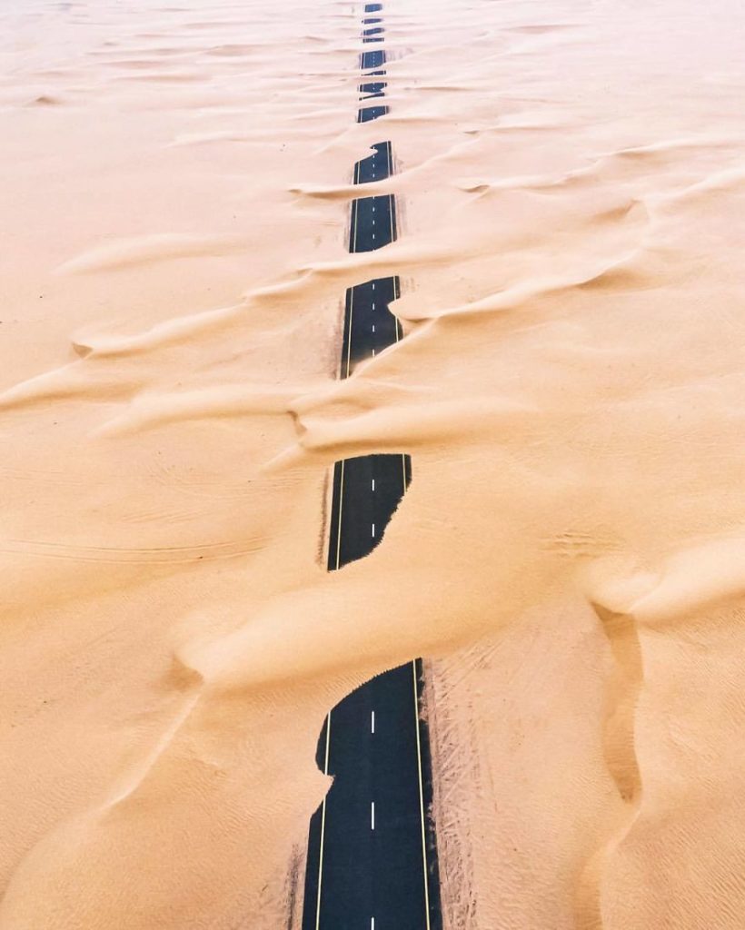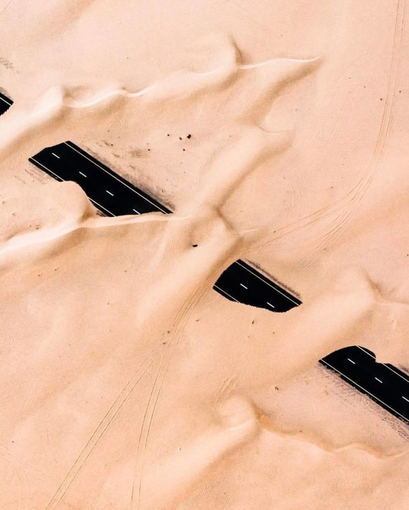 Az ausztrál Iraneus Herok lélegzetállító drónfotókkal mutatja meg azt, hogyan kebelezi be nap mint nap a sivatag homokja az Emírségek úthálózatát.