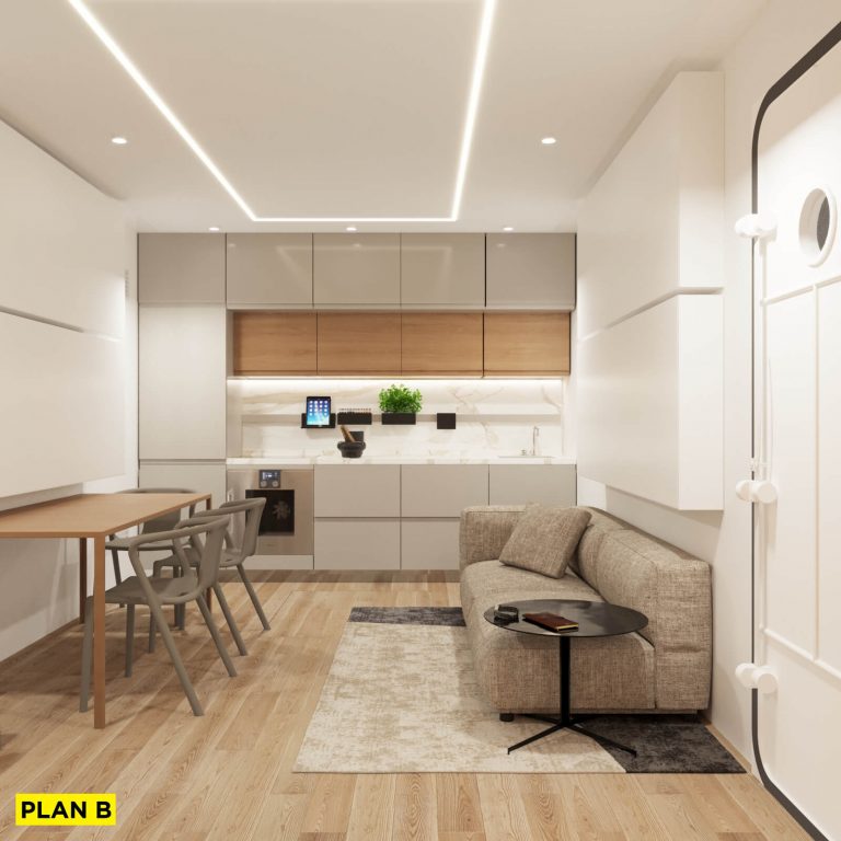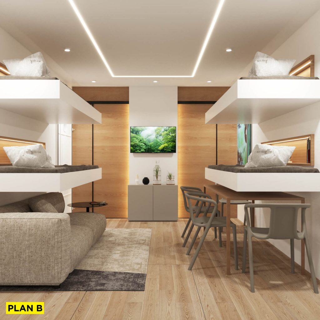 Ezen kívül fontos szerepet játszik a belsőépítészet, a színek és egyéb apróságok is. Itt a klausztrofóbia okozhatja a legnagyobb kihívást az ott tartózkodónak, egy amúgy is erősen megváltozott élethelyzetben. Igyekeztünk erre is gondolni a tervezés során és számtalan dologgal tesszük elviselhetőbbé megrendelőinknek a kabinban tartózkodást, még abban az esetben is, ha gyermekekkel kényszerült a föld alá menekülni.