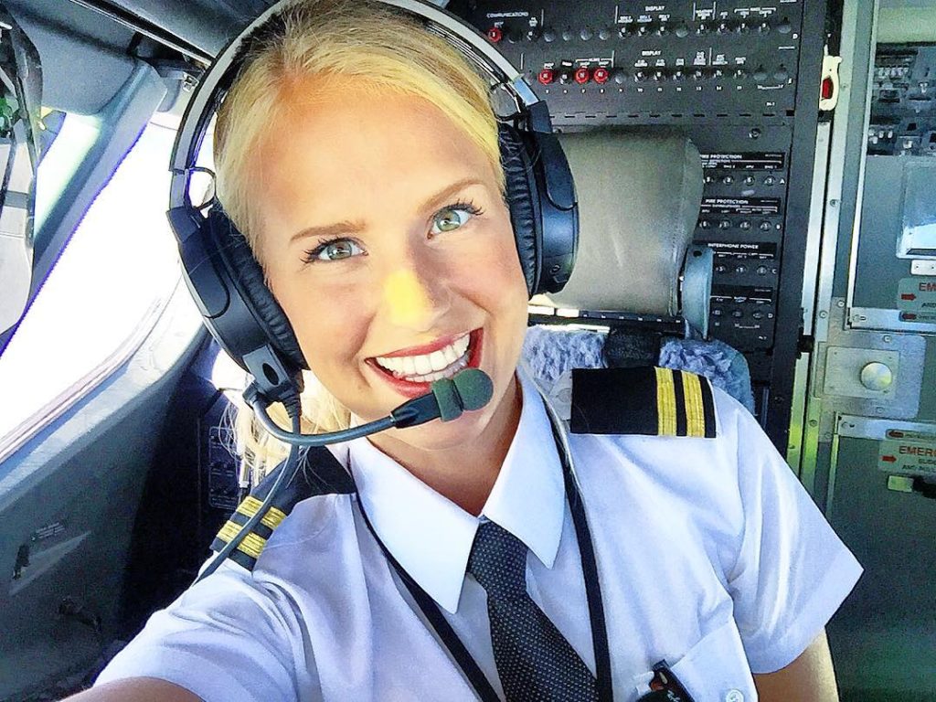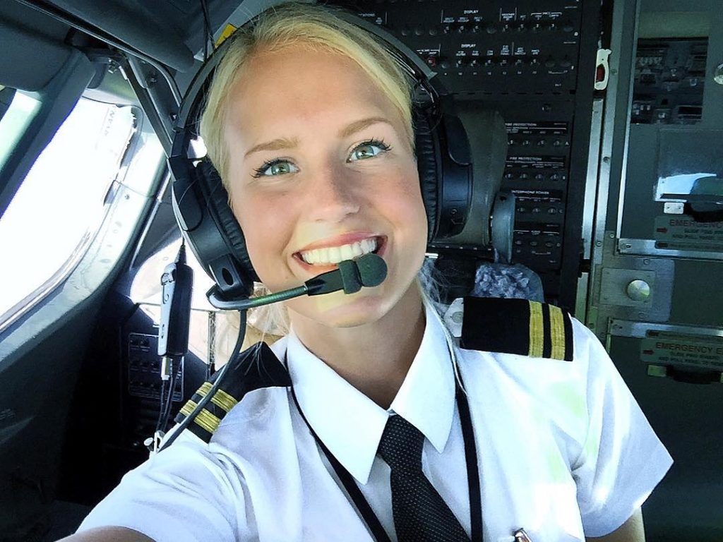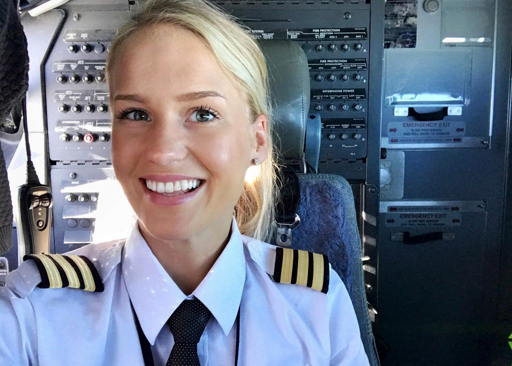 A szőke szépség folyamatosan mosolyog, valamint szeret jógázni, és eközben egy B737-est vezet.
