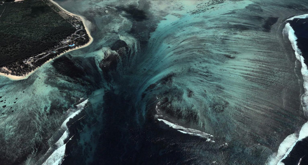 A levegőből fotózva úgy tűnik, mintha Mauritius délnyugati csücskénél a tengerben egy víz alatti vízesés lenne: