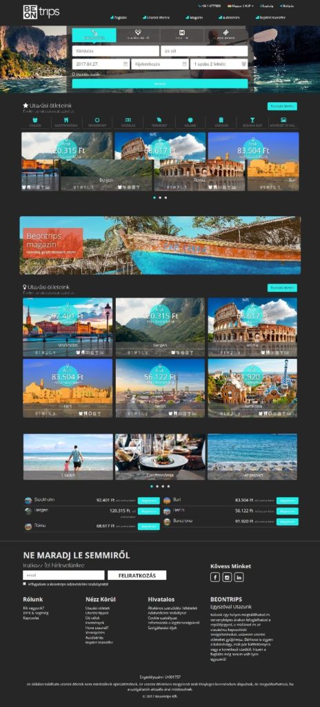 Az új hazai startup vállalkozás, a Beontrips ötvözi a repülőjegyfoglaló és szállásfoglaló oldalak legjobb szolgáltatásait. Innovatív térképes utazástervező segít az utazás megtervezésében, ahol az utazni vágyók egyszerűen és saját maguk állíthatják össze a teljes, akár több földrészen található állomásokat összekötő utazásukat. Az ajánlatokat rendkívül könnyen használható, letisztult és felhasználóbarát weboldalon keresztül, mint egy webáruházban – minden bizonytalansági tényezőt kizárva – a digitális kosárba téve azonnal meg lehet vásárolni.