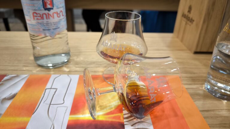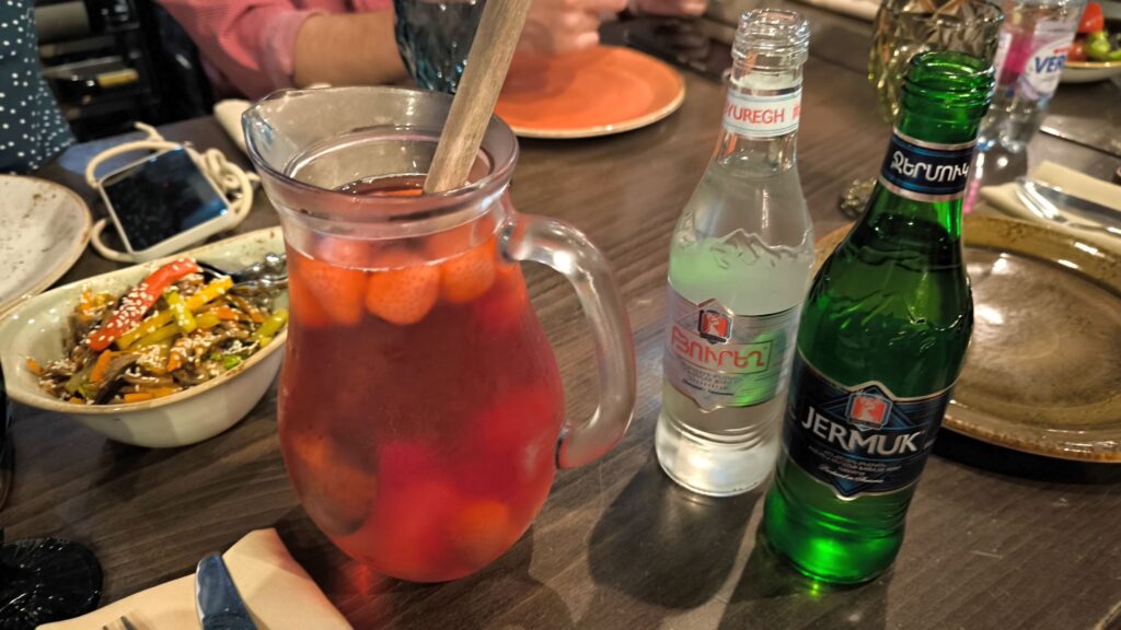 A leghíresebb örmény márka, az Ararat múzeumának meglátogatása tehát kötelező (és érdekes) program Jerevánban, de van más innivalójuk is. Az étkezés része például a kompót, ami magyar szemmel leginkább egy üveg kancsóba borított gyümölcsbefőttnek tűnik, vízzel felhígítva. Ittunk epreset, cseresznyéset, somosat és homoktöviseset is, és ha a forró nyári napokon a tömény cukros lé talán nem a legkomfortosabb dolog, élménynek mindenképpen érdekes jól bekompótozni az ebéd vagy a vacsora mellé.
