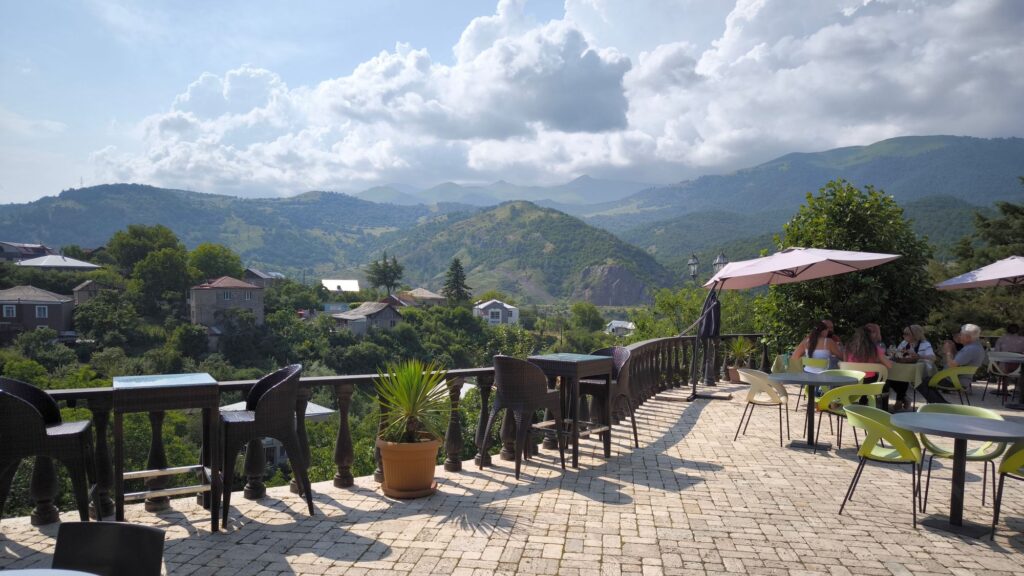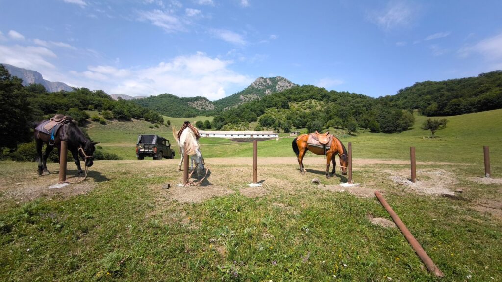 A Dilijan nevű üdülőkörzet népszerű túracélpont, de minket itt inkább komikus, mint emlékezetes kalandok vártak. Megtudtuk, hogy az örmény tíz perc igazából félóra. Az első tíz perc útszéli várakozás után megérkezett értünk egy ütött-kopott terepjáró, hogy további tíz perc alatt felvigyen minket egy gyönyörű hegyoldalba lovagolni. Itt töredékes orosz nyelvi emlékeket felhasználva megbeszéltük, hogy egy óra lovaglás elég lesz, és hát elég is volt, bármilyen szép erdőkben, patakokban döcögtünk is a kis hegyi lovakon. Utána újabb tíz perc telt el, mire visszajött értünk az autó, és még tíz perc volt, míg leértünk az úthoz. Ezután már csak tíz percet kellett várni, amit egy kisbolt sörkínálata tett szórakoztatóbbá, amíg megérkeztek a többiek. A csapat másik fele ugyanis terepjárós túrára ment; az ő fejük leégett a lehajtott ponyvájú parancsnoki UAZ-okban, viszont legalább látták leesni a lóról idegenvezetőnket, aki egy rögtönzött lovasbemutatóval próbálkozott fenn a hegyen a kedvükért.