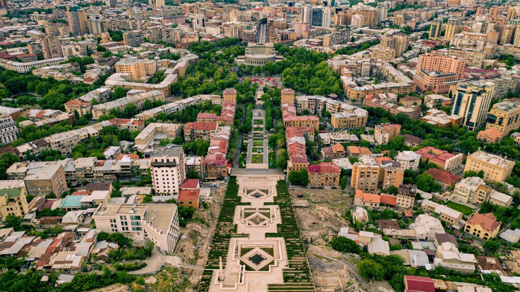A Budapest fele méretű, népességű Jerevánban hangulatosan és meglepően ízlésesen elegyednek egy nagyon érdekes, XX. század eleji tudatos városépítészeti folyamat eredményei, a háború utáni szovjet tagállami múlt betonszörnyei és a legújabb idők épületei. A meghatározó motívum mindig, mindenhol és minden korból a vöröses-feketés vulkáni tufakockákból rakott fal. Ez az a helyi sajátosság, ami miatt sehol sem lehet elintézni az örmény utcaképet azzal, hogy ugyan már, ez pont olyan, mint..., mert sosem pont olyan, sem a villanegyedekben, sem az üdülőfalvakban, sem a városközpontban, sem a templomoknál.