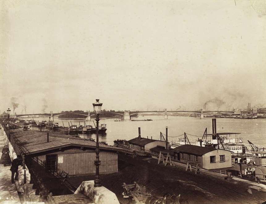 A Margit-híd panorámaképe és a Duna pesti rakpartja a rakodótérrel. A felvétel 1890. után készült