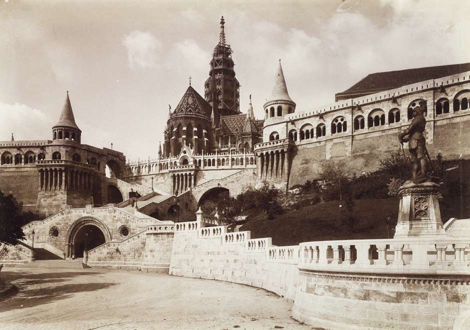 Halászbástya és az épülő Mátyás torony, előtérben Hunyadi János szobra. A felvétel 1890. után készült