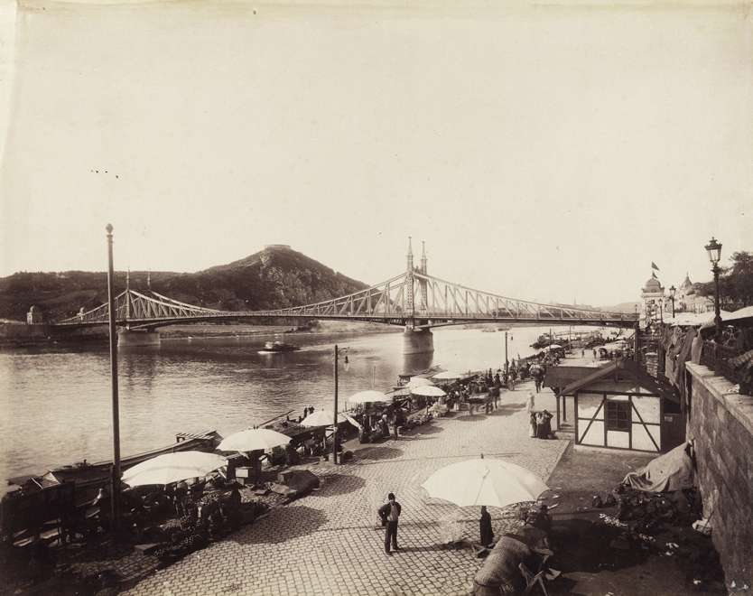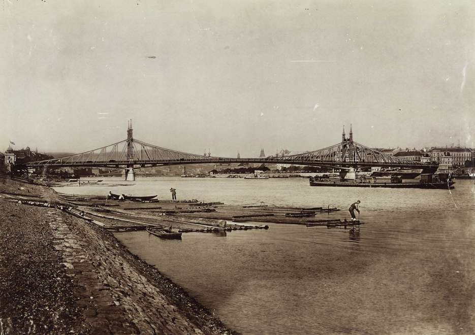 Faúsztatók a Duna budai partján az egykori Ferenc József, ma Szabadság híddal. A felvétel 1890. után készült