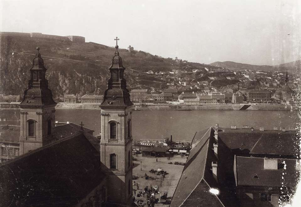 A Tabán a régi Városháza tornyából nézve, előtte a Nagyboldogasszony fő-plébániatemplom tornyaival. A felvétel 1890. után készült