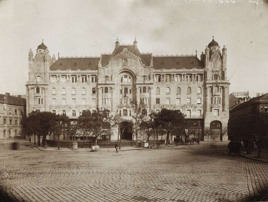 A Gresham-palota homlokzata az előtte lévő kis parkkal. A felvétel 1890. után készült