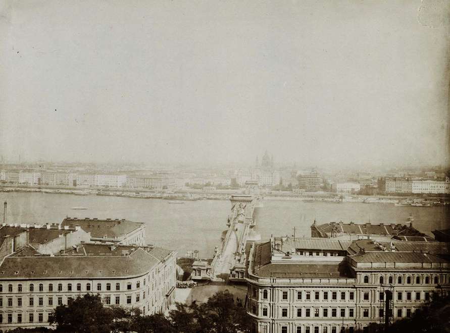 Panorámakép a Duna pesti oldaláról, középen a Lánchíddal. A felvétel 1890. után készült