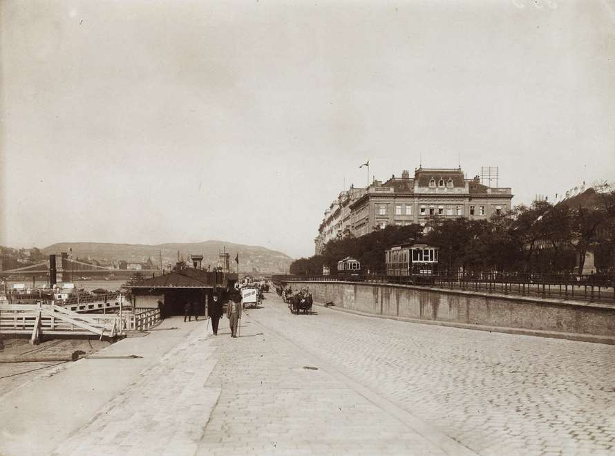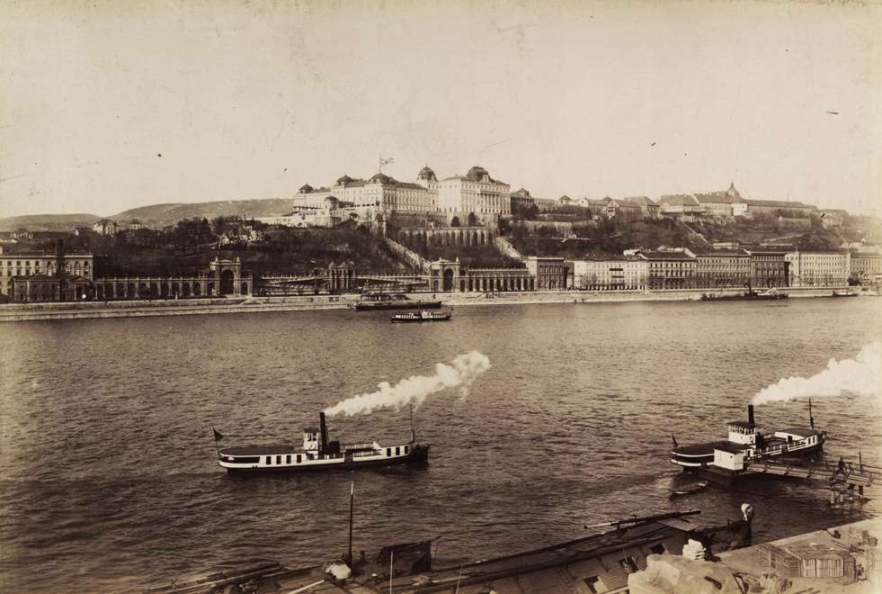 A pesti Duna-part panorámaképe, háttérben balra a Lánchíddal, jobbra Magyar Tudományos Akadémia épületével. A felvétel 1890. után készült