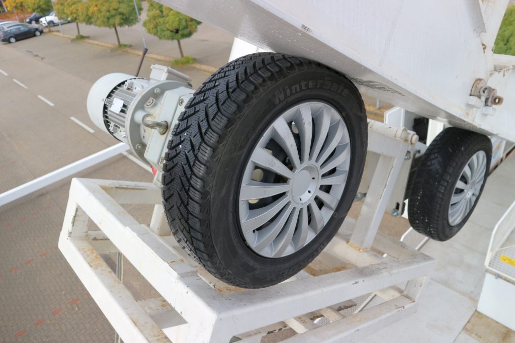 Ha már közlekedésbuzéria: az óriáskereket nyolc darab (egyébként Renault-felnire szerelt) téli gumi forgatja, dörzshajtással. A hajtó villanymotorok (kerekenként egy-egy) 5,5 kilowatt csúcsteljesítményűek, de a rendszer villamos hálózatát úgy alakították ki, hogy egy tíz amperes biztosíték elbírja az egészet. Mivel a 41 méter átmérőjű kerék körülbelül hárompercenként tesz meg egy teljes fordulatot, kiszámolható, hogy az óriáskerék kb. 2,6 km/h sebességgel nem megy sehová, miközben forog.