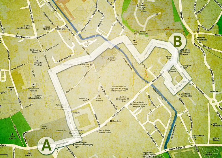 A macskaköves minorita templomos teret a megnyugtatóan zubogó Eger-patak fölött ívelő kis kőhídon elhagyva sétáljunk fel lassan a girbe-gurba utcákon. Nézzünk át a turistaboltok áj láv Eger-pólós porhintésén, és hagyjuk, hogy földig essen az állunk, mennyire gyönyörűek is ezek a több száz éves, fagerendás, vaskapus, nyikorgó cégéres, cinkos tetőablakos, színes-kopott kis házak a Kossuth Lajos, Hibay Károly, Fazola és Gólya utcákon. Majd ha már kellően elfáradtunk, és mindezt kényelmesen ülve szeretnénk tovább csodálni, igyunk egy, egri-úgyhogy-nem-lehet-rossz pohár bort a Dózsa György téri kis teraszok egyikén.