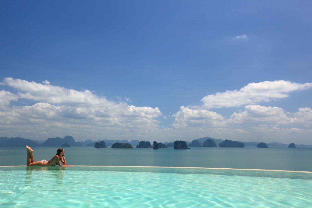 A Phang Nga-öbölre panorámás ez az infinity pool, ami olyan fergetegesen néz ki, hogy mi biztosan ide kérnénk a reggelit. Meg az ebédet, és akkor már a vacsorát is.