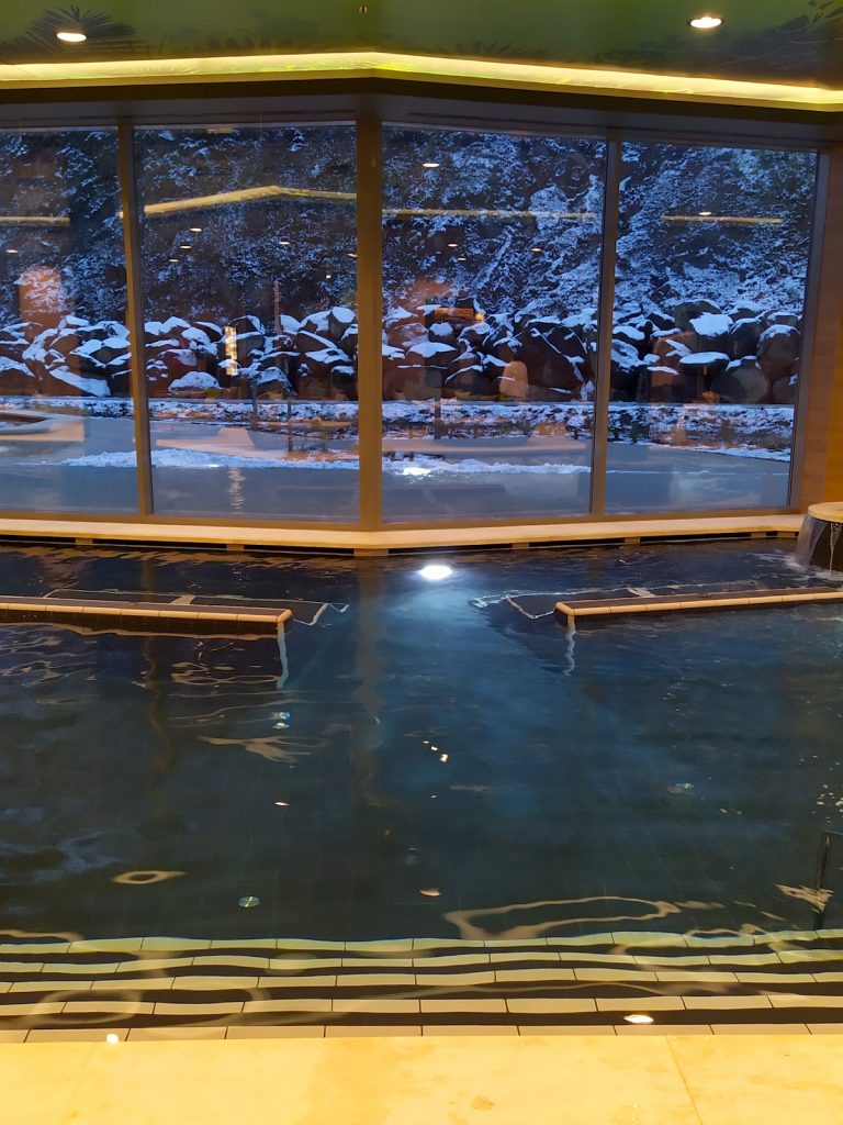 De nem azért vagyunk a szállodában, hogy egész nap a szobában üldögéljünk, pláne mert odalent egy különleges világ vár. Fűtött és fedett úszómedence, szabadtéri élménymedence – ez még csak a bemelegítés, illetve a szó szerinti bemelegítést elvégeztük korábban a finn szaunában, és onnan már nem jelentett problémát az enyhe mínuszokban egy szál fürdőnadrágban átsétálni a szabadtéri 35 fokos medencébe.