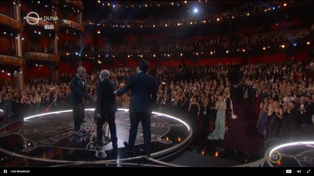 Hihetetlen, de a 87 éves zeneszerző az Aljas nyolcas filmzenéjéért kapta meg első Oscarját (ha a 2007-es életműdíjat nem számítjuk). Az egész Dolby Színház felállva tapsolt neki, ahogy felsétált a színpadra.
