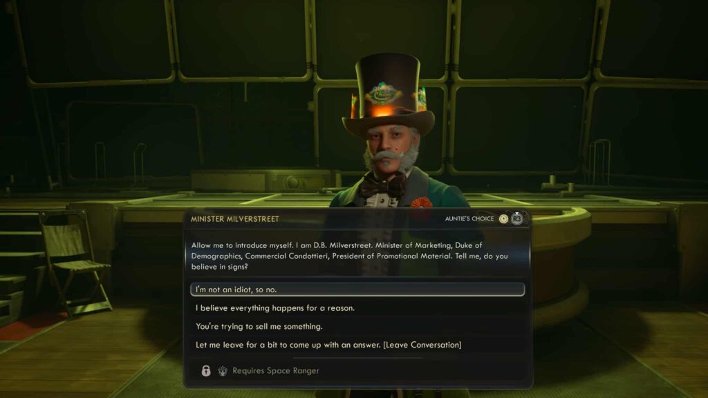 A játékba csempészett dialógusok kulcsfontosságúak mind a missziók teljesítéséhez, mind ahhoz, hogy igazán átéljük ezt a jópofa disztópikus maszlagot. Információkat gyűjthetünk, balhékba keveredhetünk vagy konfliktusokat simíthatunk el sima smúzolás révén – vagy elégséges mennyiségű speech szkillpoint birtokában –, de embereinkkel, bizalmasainkkal is közelebbi viszonyba kerülhetünk, amikor tanácsot kérnek tőlünk egy-egy kényes helyzetben... vagy akár le is teremthetjük őket, szóval a döntés rajtunk áll.