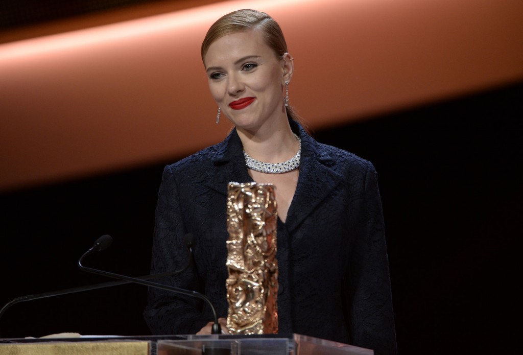 Minden nő szereti a szép ékszereket, egy színésznő pedig a nagy, díj alakú, arany borítású kiegészítőkért van oda. Scarlettnek is jól áll ez a César-díj, amivel pózol.