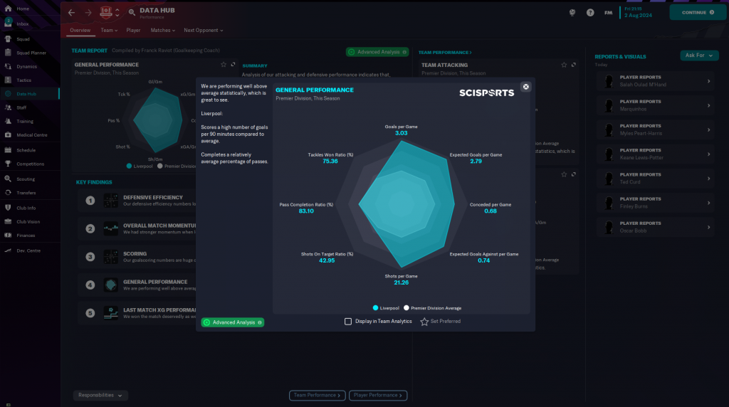 A játékban a való életből is ismert, teljesítményelemzéssel foglalkozó SciSports algoritmusai tájékoztatnak bennünket néhány érdekesebb statisztikai fejleményről: melyik játékosunk a legveszélyesebb a kapu előtt, melyik adja a legtöbb kulcspasszt, hogyan muzsikál a csapatunk védelme a ligaátlaghoz képest, és hány gólt kellett volna rúgnunk az idei szezonban, vagy akár az előző meccsen.