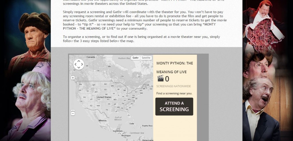 A csoport arra készül, hogy Amerikában amolyan közösségi finanszírozással vigyék el a filmet minél több moziba, és ebben a minden bizonnyal Python-fan közösség tagjainak segítségét kérik. Aki szeretne egy vetítést összehozni a lakóhelye közelében lévő moziban, annak csak kapcsolatba kell lépnie a GATHR Films-szel – ők forgalmazzák a dokumentumfilmet Amerikában – és el kell kezdenie nézőket toborozni a vetítéshez. Ha összejön egy kritikus minimum szám, akkor létrejön a vetítés.