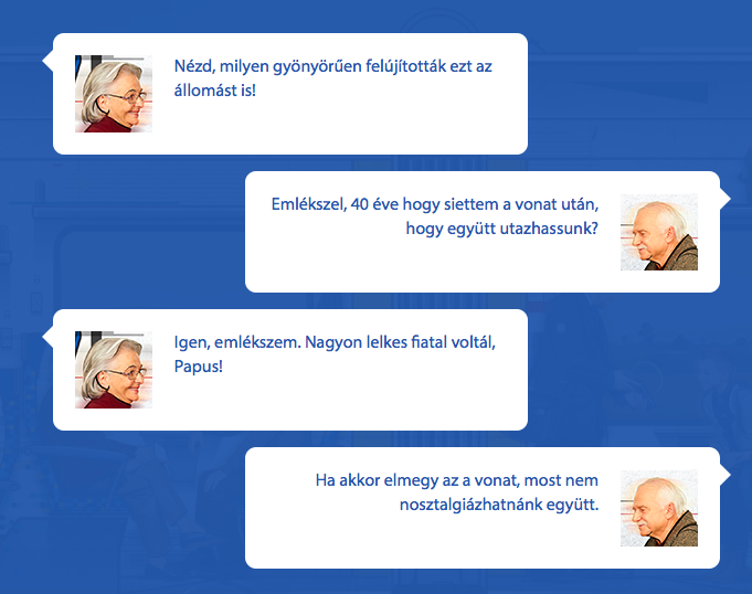 A MÁV dicshimnuszát zengő oldalon egy csodálatosan idilli vonatos utazás teljesen, abszolút természetes párbeszédeibe pillanthatunk bele, ha rákattintunk a teljesen élőbeszédszerűen kommunikáló és abszolút hamisítatlanul boldog emberkék pöttyeire. És ilyeneket kapunk: